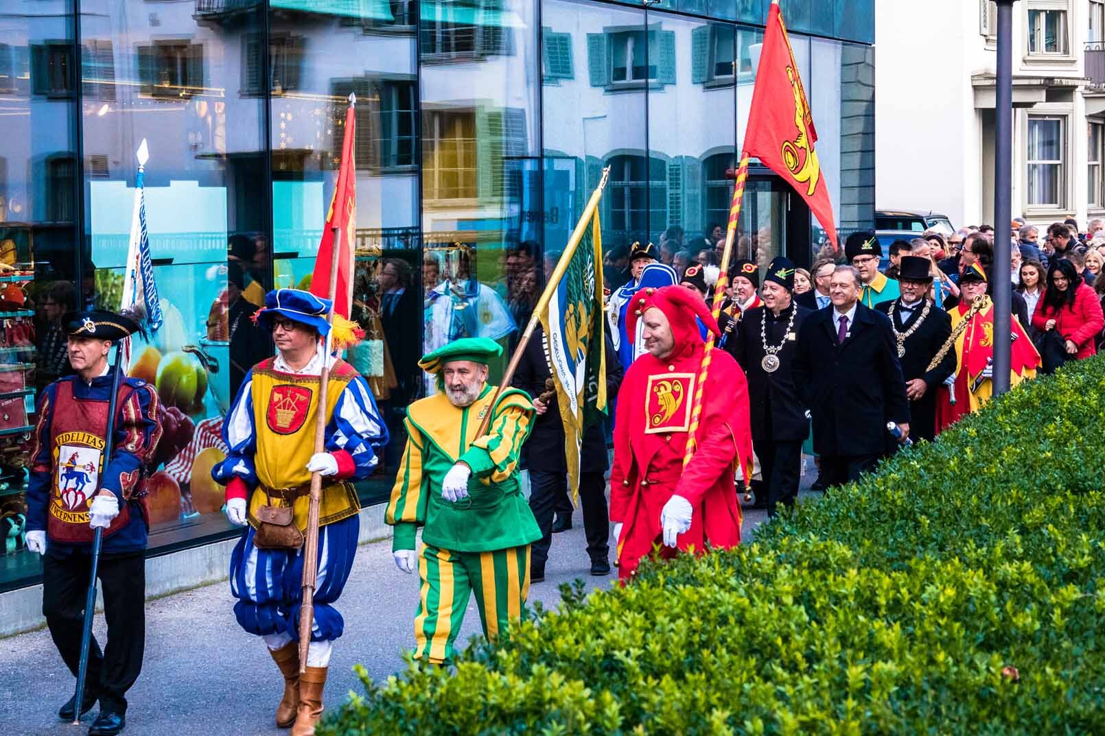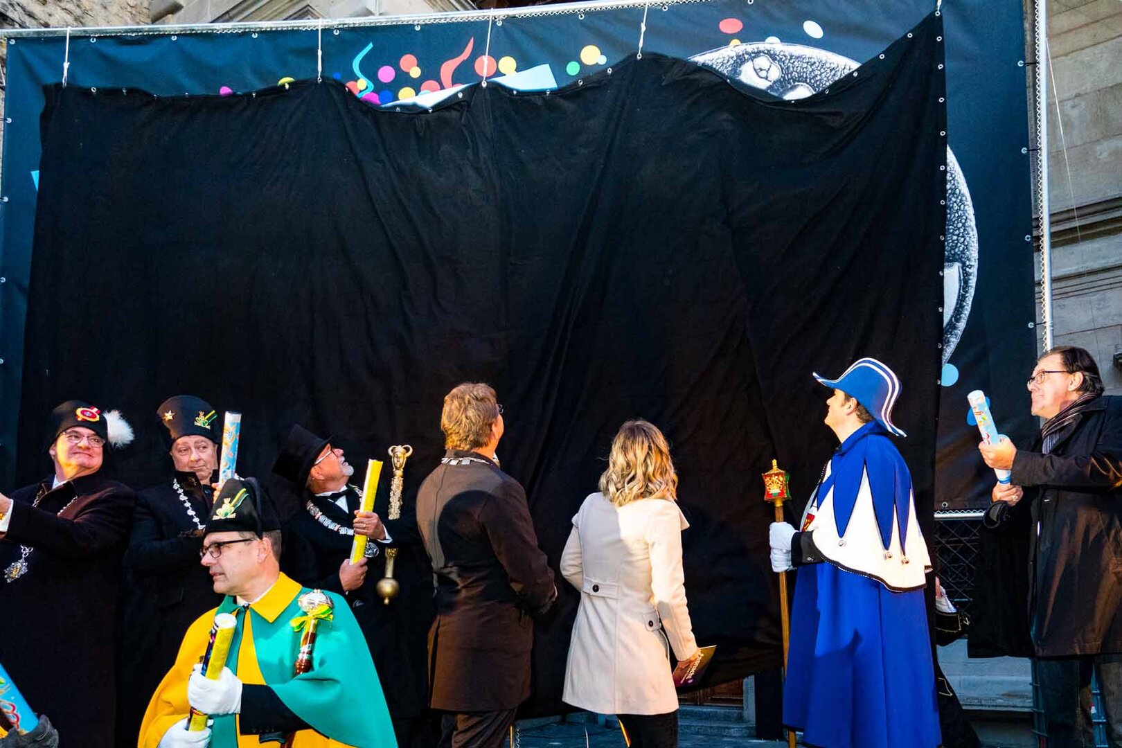 Begleitet von den Näbelhüüler, Göggu-Schränzer, Gluggsi-Musig und der Noggeler-Kleinformation marschierten die Fasnachtsgewaltigen durch die Altstadt Luzern. Perfektes Fasnachtswetter - sonnig und schön, aber durchaus kalt - bildeten den idealen Rahmen dazu. Die diesjährige Plakettenpräsentation moderierte die charmante Tele1-Moderatorin und baldige SRF-Samschtig-Jasskönigin Fabienne Bamert. So wurden erst die Prägewerksponsoren Herzog Haustechnik AG (genau, dieser Herzooooooog) sowie der Leisibach Entsorungs AG verdankt, bevor die zweit- und drittplatzierten Plakettenkünstler zu Ehren kamen. Und dann, mit Trommelwirbel und improvisierten Fötzaliregen, wurde sie enthüllt: die neue Fasnachtsplakette 2020, gestaltet vom bekannten Luzerner Künstler Basil Koch!