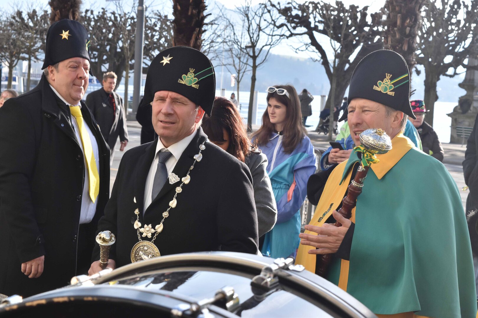 pf. Zack-peng-bumm, was für eine Stimmung! Beim Betrachten der Stimmungsbilder vom Wey-Zmorge im Schweizerhof käme niemand darauf, dass diese Zmorge-Party bereits um 06:37 Uhr startete. Ausgelassene Fröhlichkeit zu tollen Guuggerklängen der Alte Garde, der Wäsmali-Chatze und den Rotseemöven - und der brüelende Narr der Zunft zu Safran führte die Polonaise des ehrenfesten Wey-Zunftmeisters Mäsi Manetsch an.