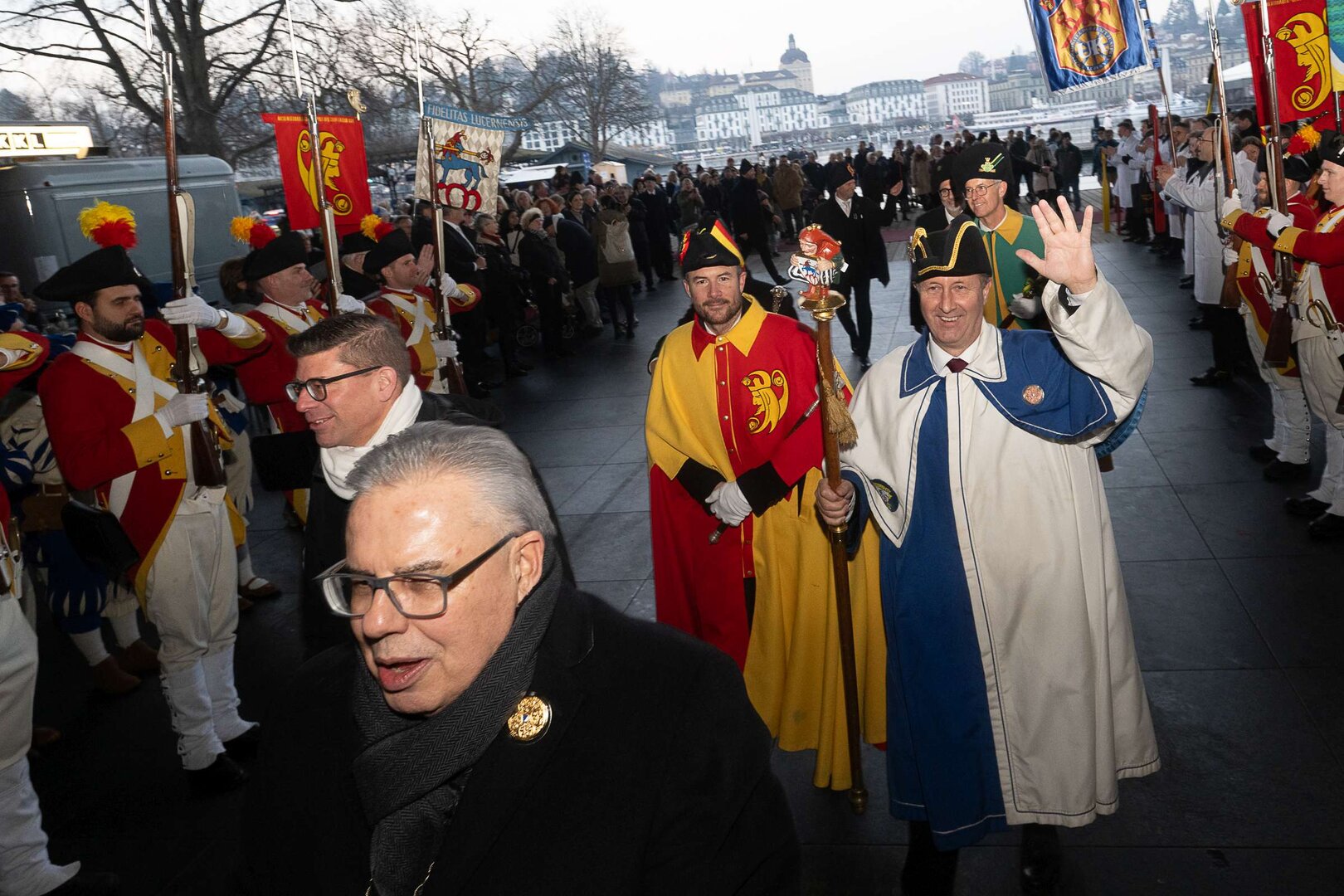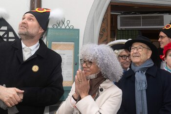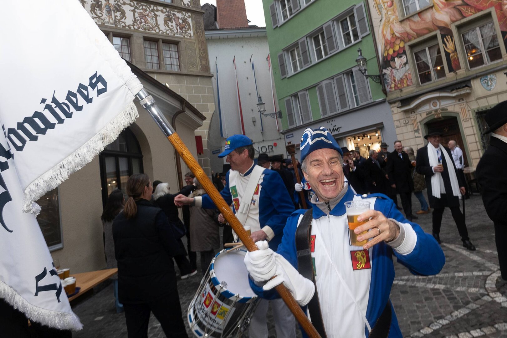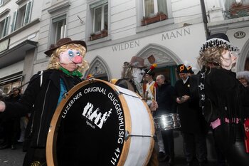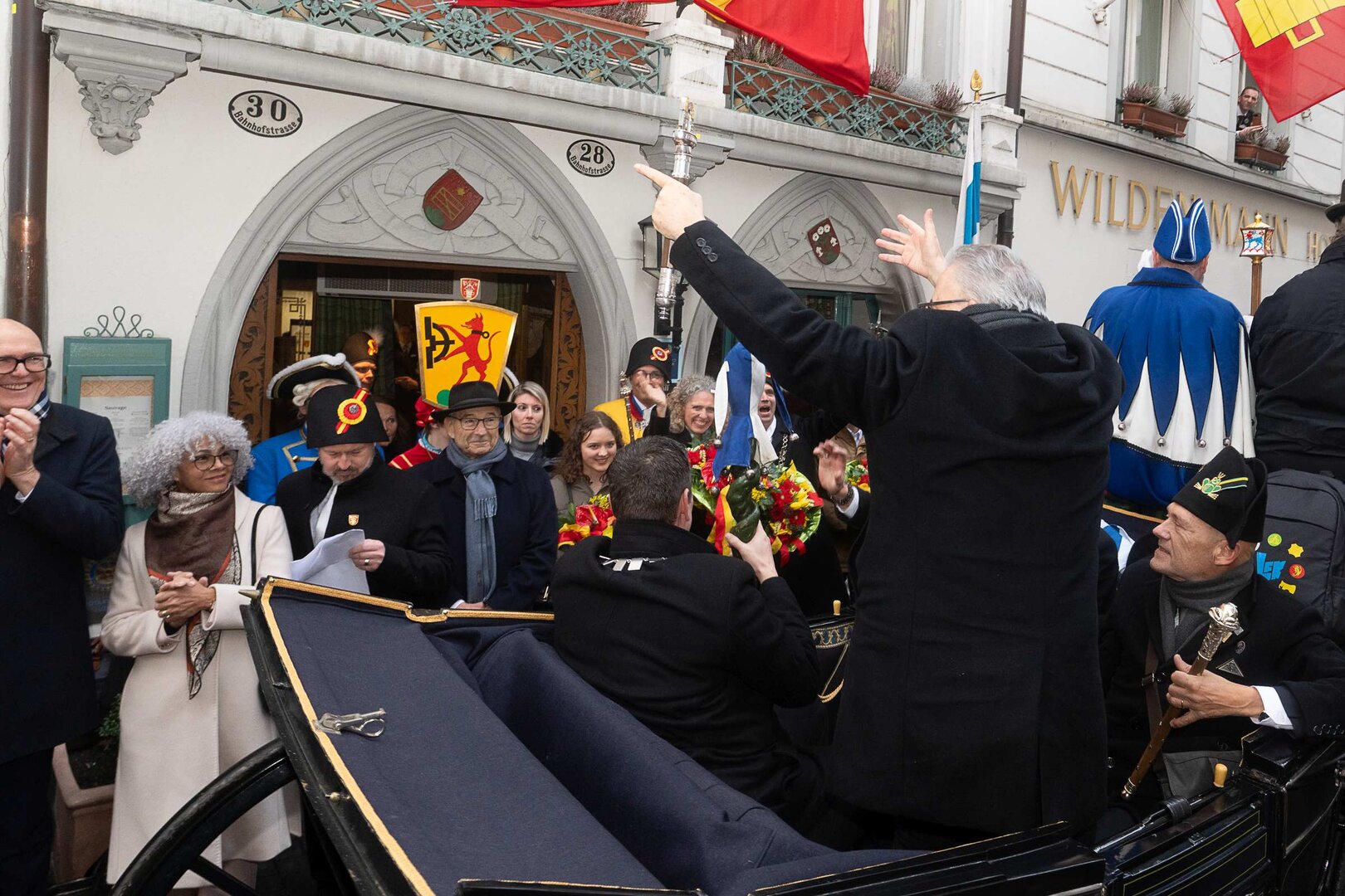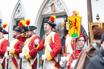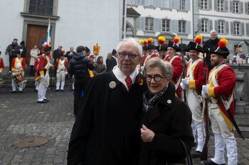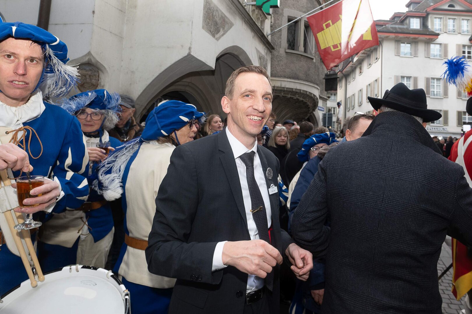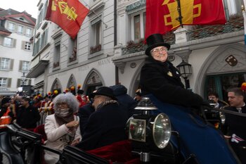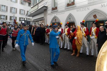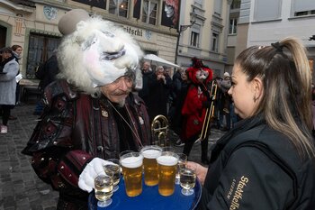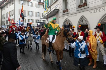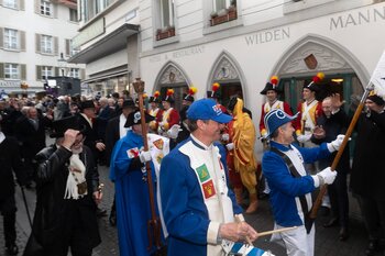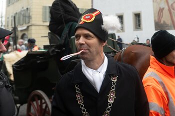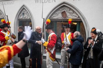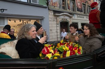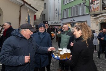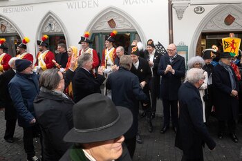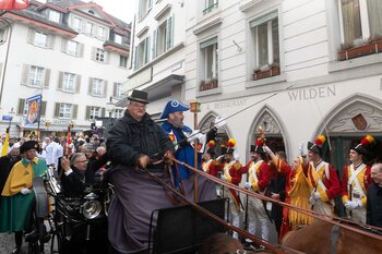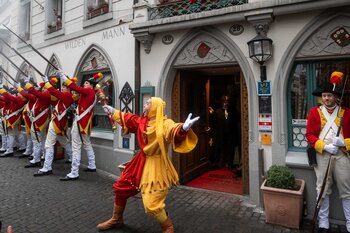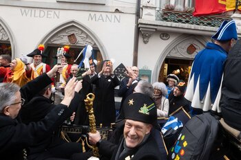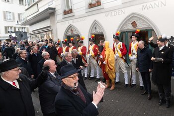 Auf dem Kapellplatz warteten bereits die Zunftgruppierungen: die strammen Grenadiere, das Umzugskomitee sowie die als Waldmanndli bekannte Historische Zunftgruppe. Die Feldmusik spielte auf, Hunderte von Freunden und Bekannten jubelten dem Fritschivater 2026 zu. Für zusätzlichen Schwung sorgte der Zunftnarr, der stilecht mit dem Lastenvelo auf den Kapellplatz rollte und das Publikum lautstark zum «Brüeleee» animierte. Nach einem ersten Umzug durch die Altstadt führte der Weg in den Wilden Mann. Dort fand mit der «Aufwartung» beim Zunftmeister der eigentliche Kern der Abholung statt. Rund zwei Dutzend Gruppen – vom Neuzünftler-Jahrgang über Vergnügungskomitees bis hin zu Delegationen aus Wirtschaft, Vereinigungen und weiteren Kreisen – überbrachten ihre Glückwünsche, meist mit viel Witz und Charme.