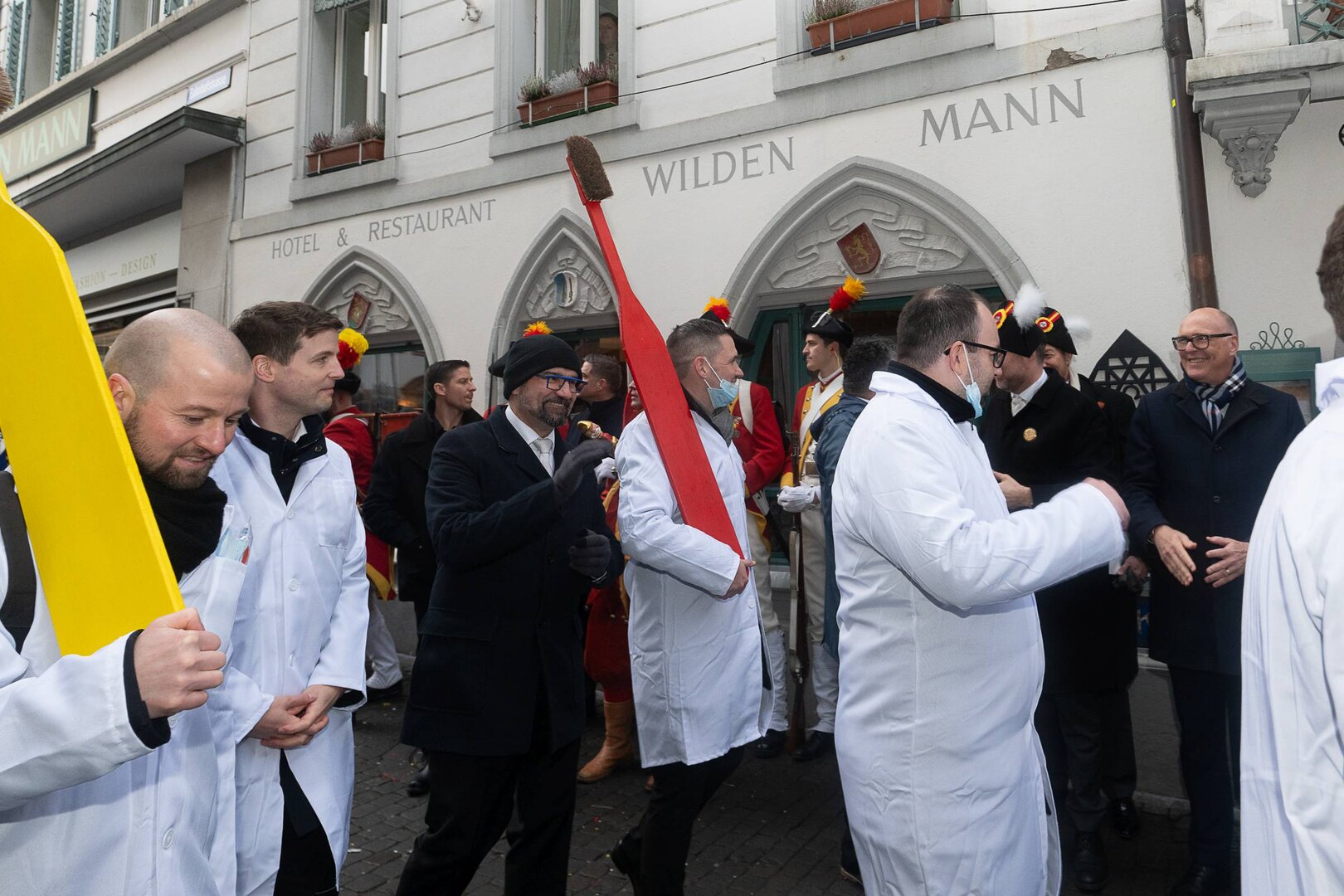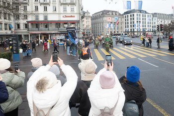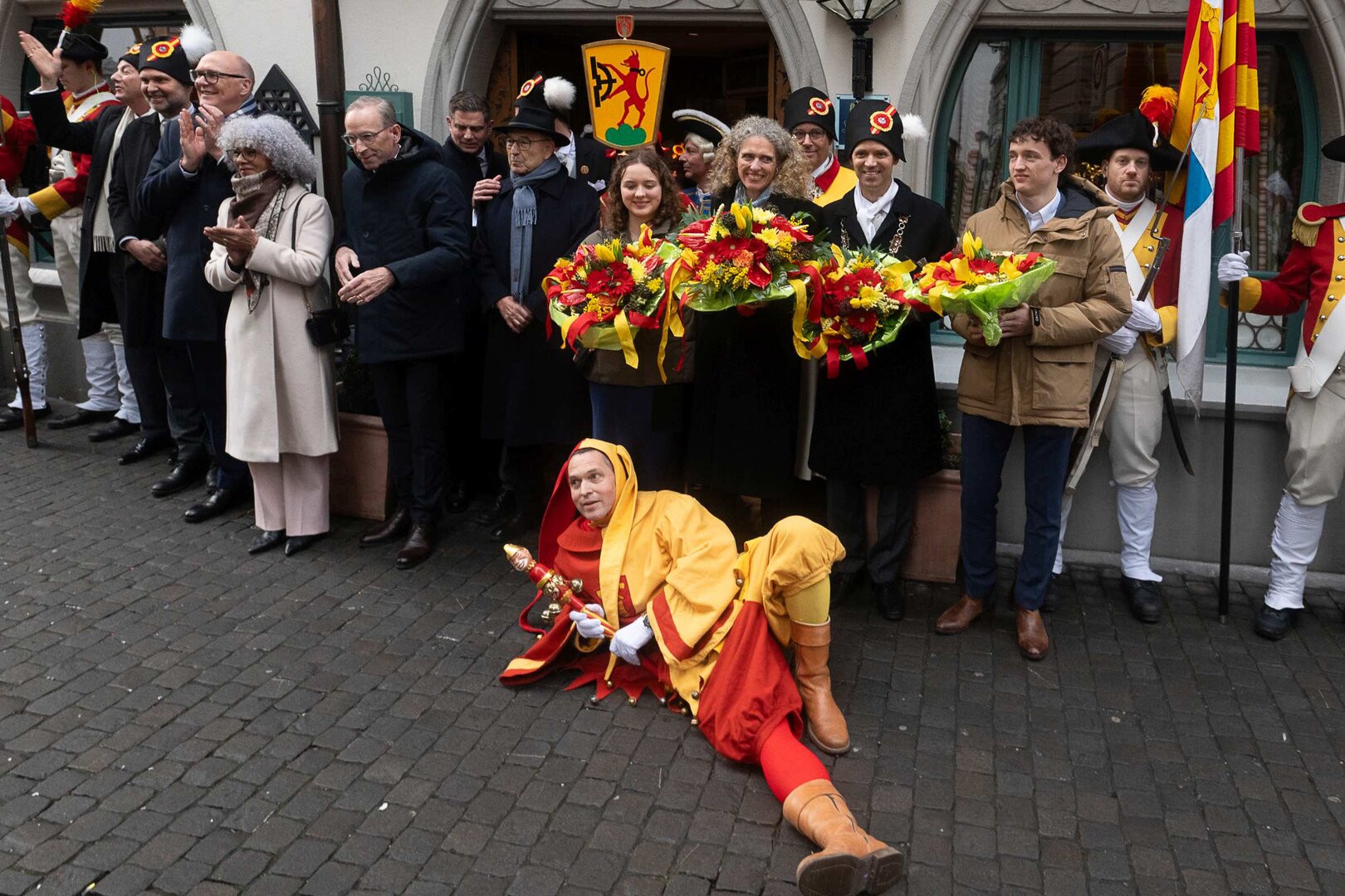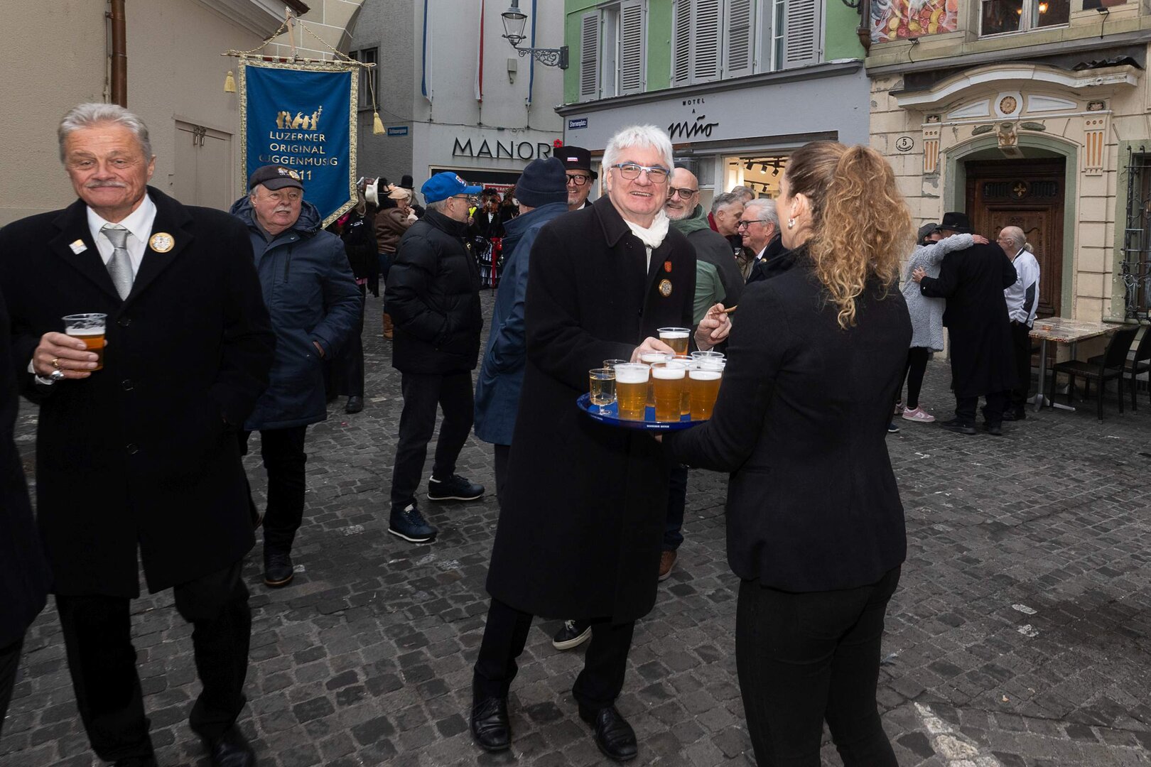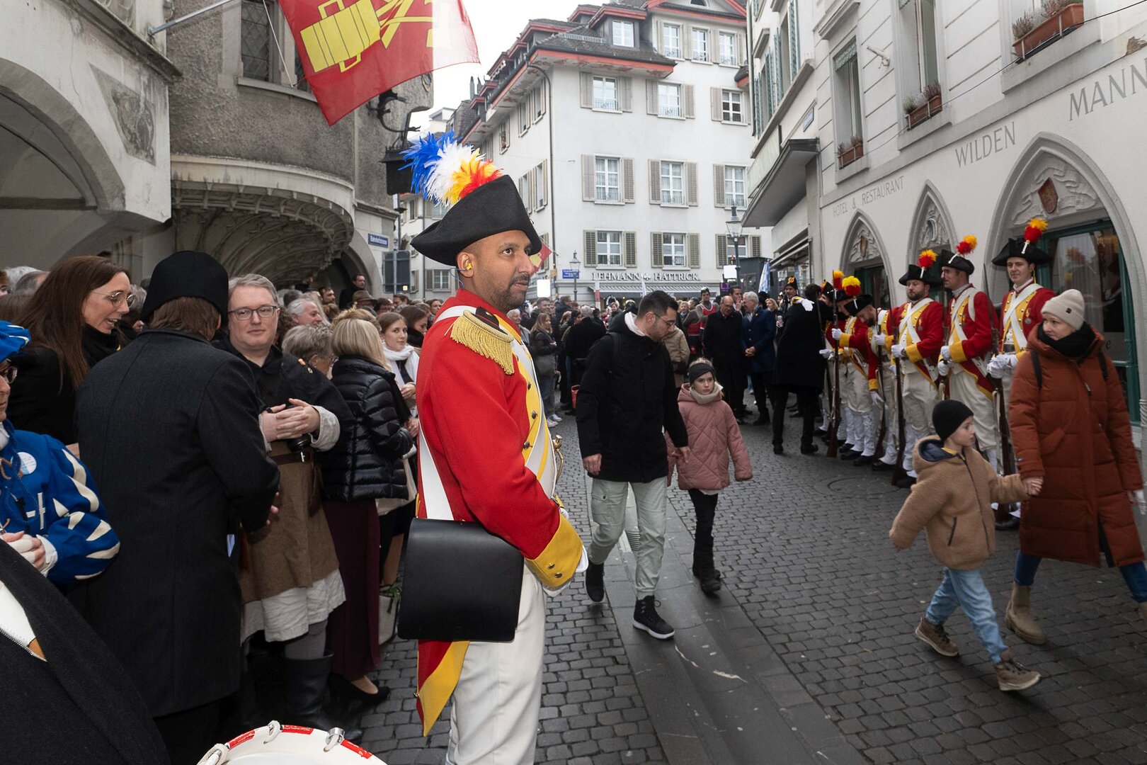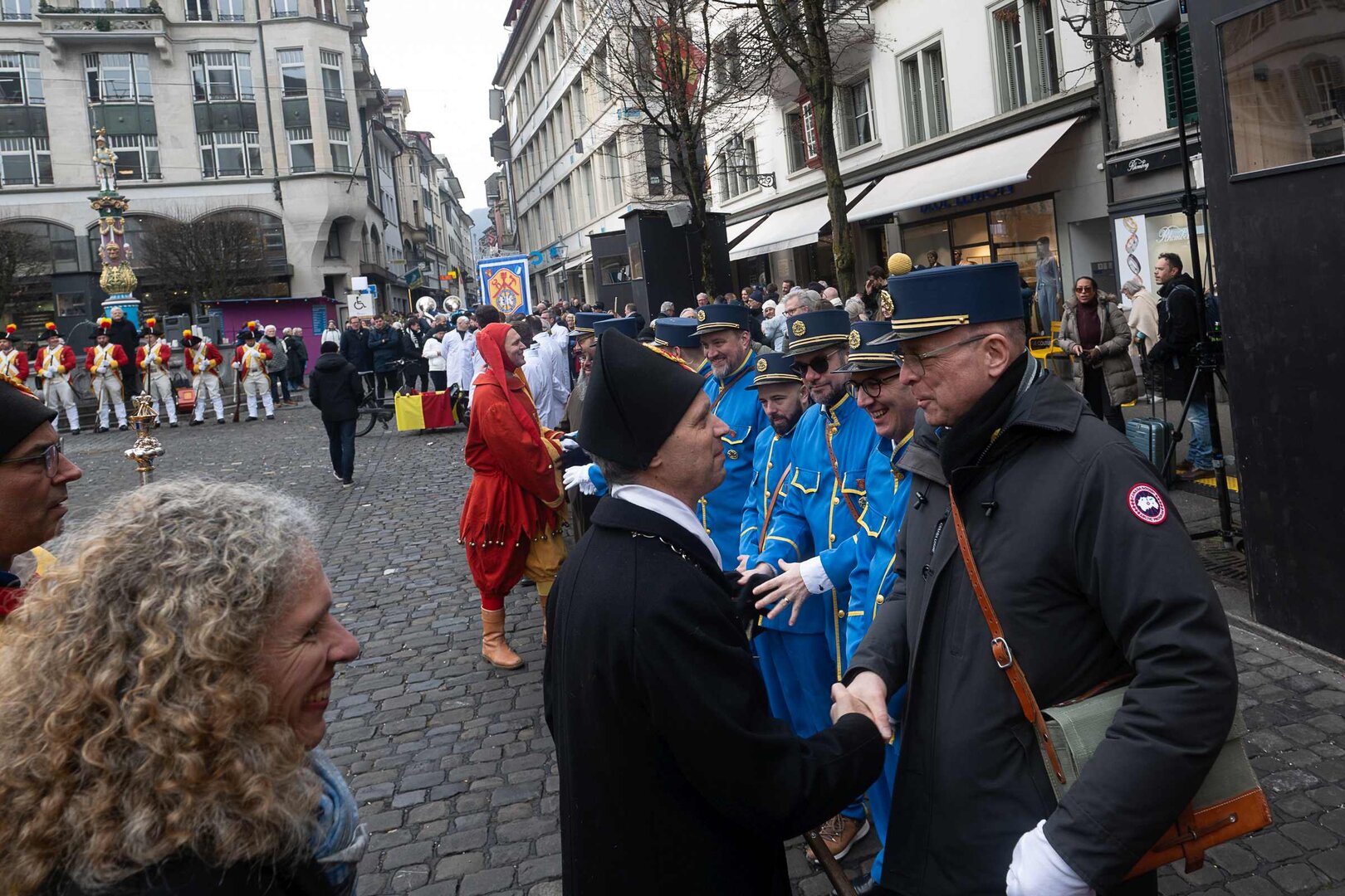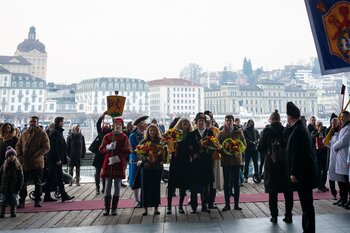 Auf dem Kapellplatz warteten bereits die Zunftgruppierungen: die strammen Grenadiere, das Umzugskomitee sowie die als Waldmanndli bekannte Historische Zunftgruppe. Die Feldmusik spielte auf, Hunderte von Freunden und Bekannten jubelten dem Fritschivater 2026 zu. Für zusätzlichen Schwung sorgte der Zunftnarr, der stilecht mit dem Lastenvelo auf den Kapellplatz rollte und das Publikum lautstark zum «Brüeleee» animierte. Nach einem ersten Umzug durch die Altstadt führte der Weg in den Wilden Mann. Dort fand mit der «Aufwartung» beim Zunftmeister der eigentliche Kern der Abholung statt. Rund zwei Dutzend Gruppen – vom Neuzünftler-Jahrgang über Vergnügungskomitees bis hin zu Delegationen aus Wirtschaft, Vereinigungen und weiteren Kreisen – überbrachten ihre Glückwünsche, meist mit viel Witz und Charme.