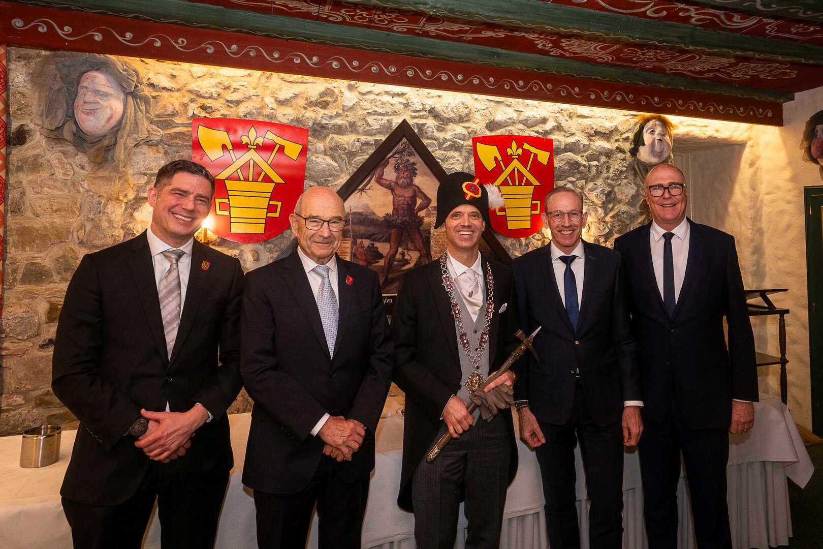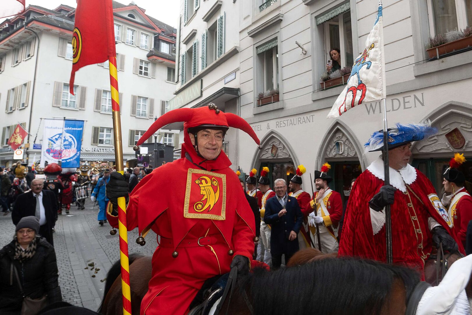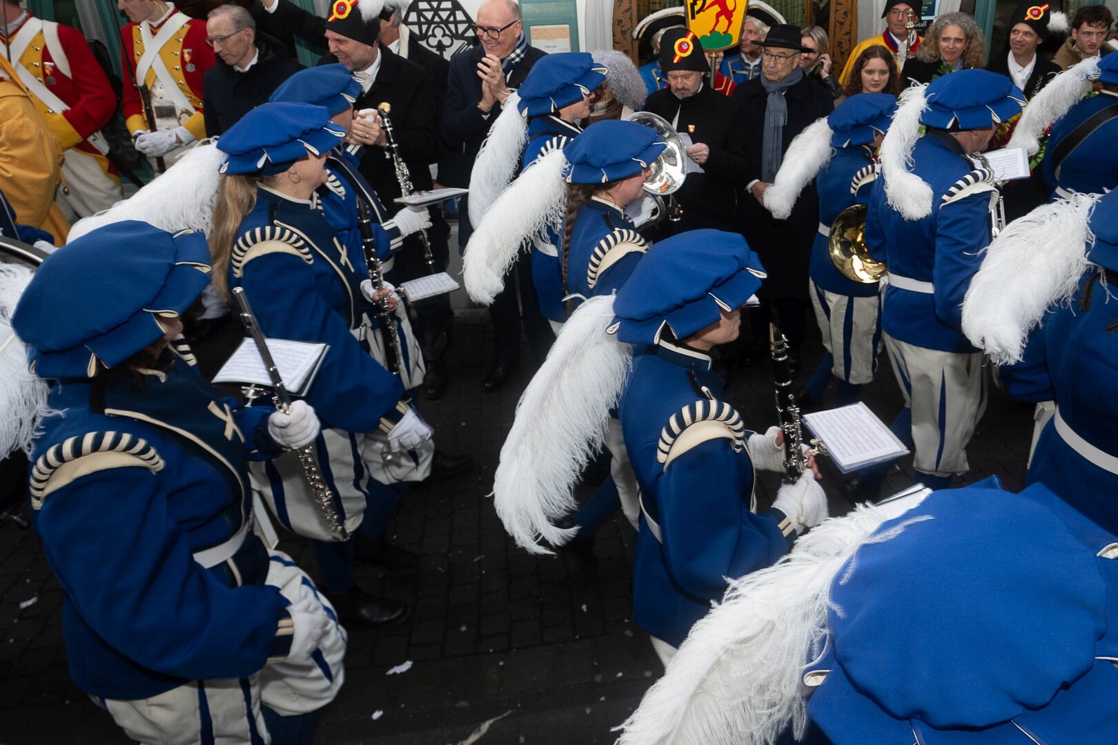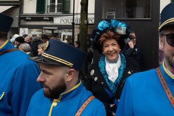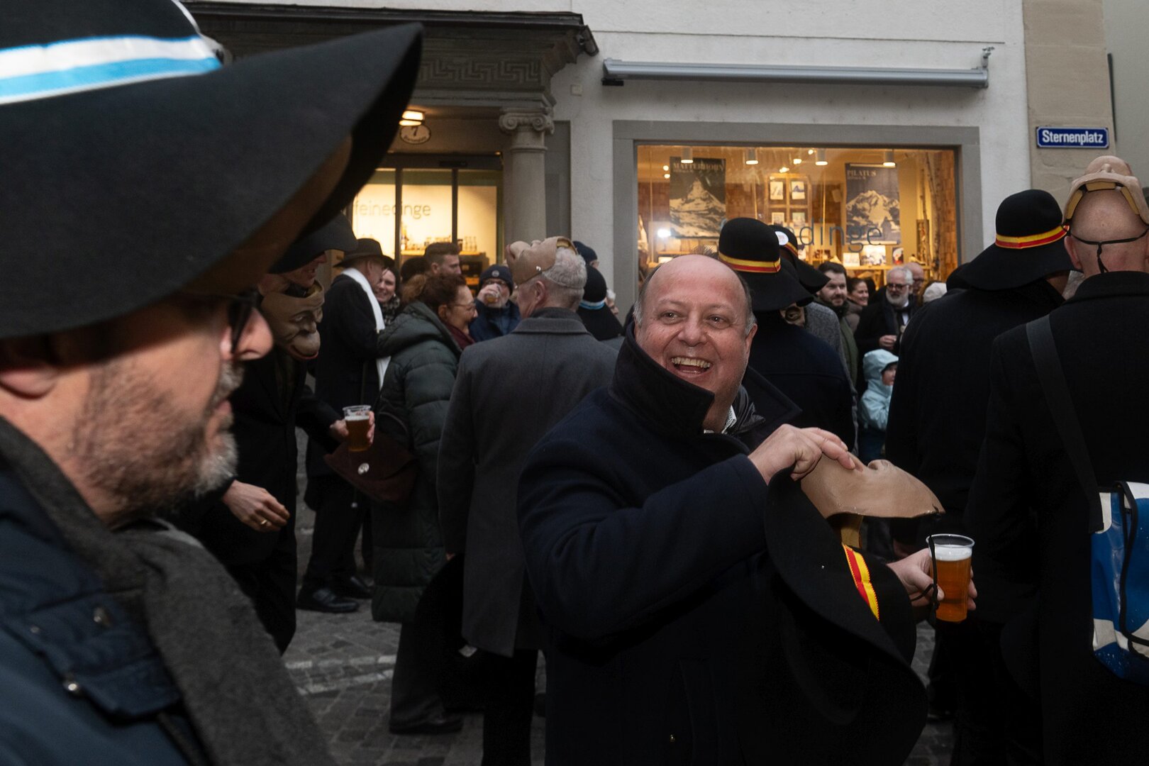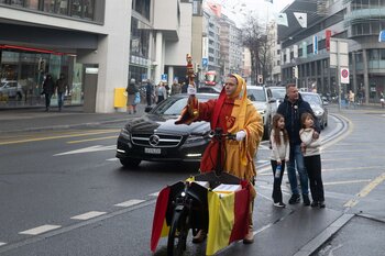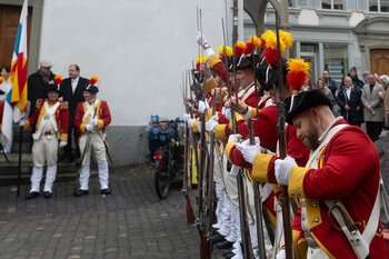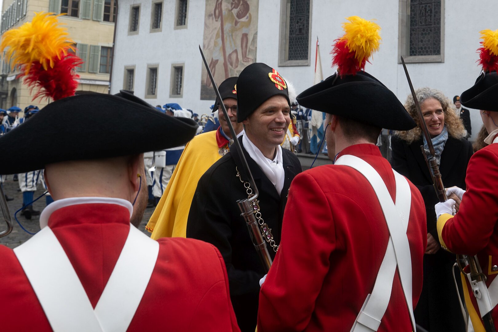 Auf dem Kapellplatz warteten bereits die Zunftgruppierungen: die strammen Grenadiere, das Umzugskomitee sowie die als Waldmanndli bekannte Historische Zunftgruppe. Die Feldmusik spielte auf, Hunderte von Freunden und Bekannten jubelten dem Fritschivater 2026 zu. Für zusätzlichen Schwung sorgte der Zunftnarr, der stilecht mit dem Lastenvelo auf den Kapellplatz rollte und das Publikum lautstark zum «Brüeleee» animierte. Nach einem ersten Umzug durch die Altstadt führte der Weg in den Wilden Mann. Dort fand mit der «Aufwartung» beim Zunftmeister der eigentliche Kern der Abholung statt. Rund zwei Dutzend Gruppen – vom Neuzünftler-Jahrgang über Vergnügungskomitees bis hin zu Delegationen aus Wirtschaft, Vereinigungen und weiteren Kreisen – überbrachten ihre Glückwünsche, meist mit viel Witz und Charme.