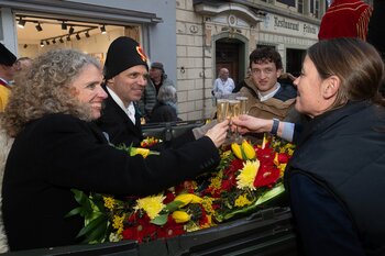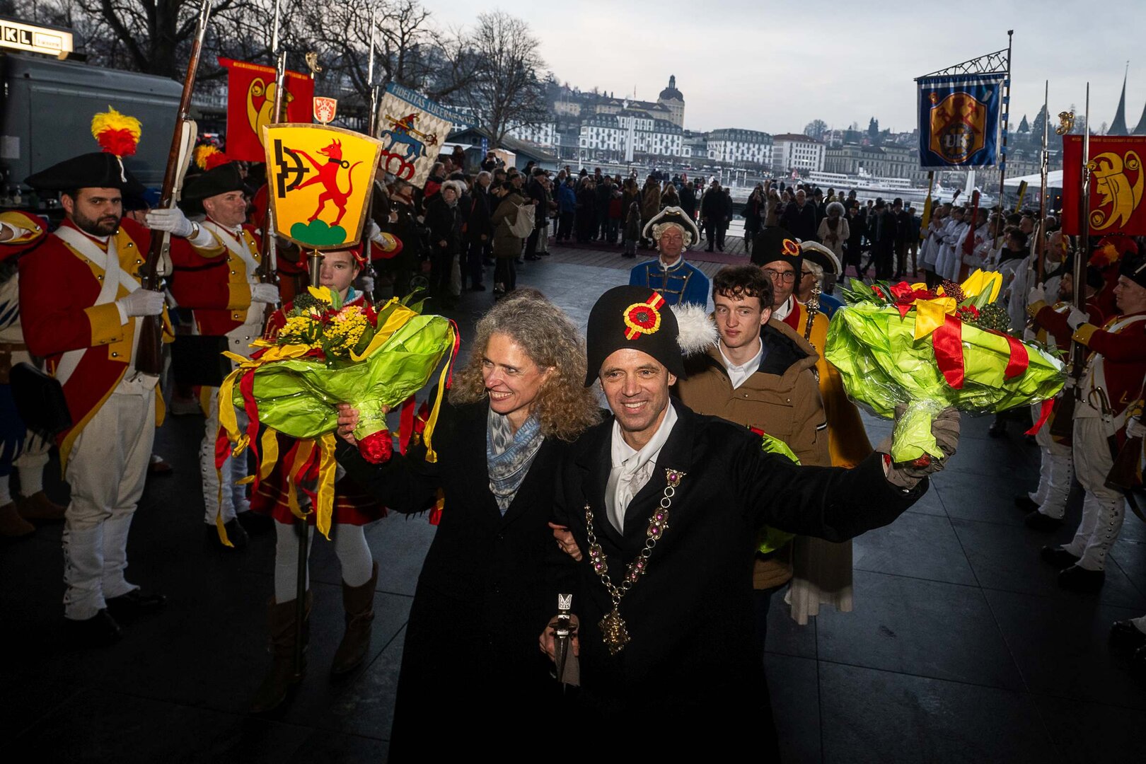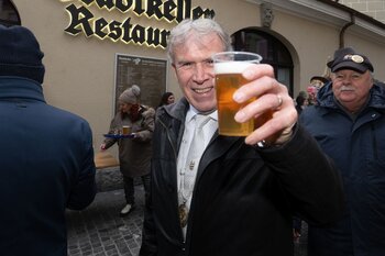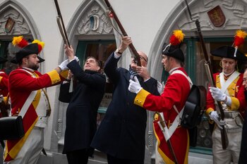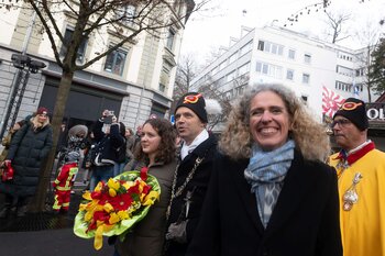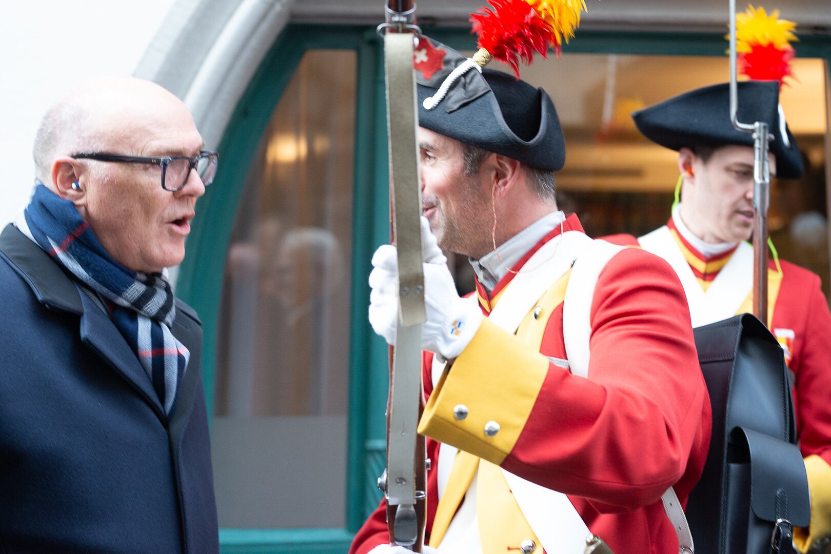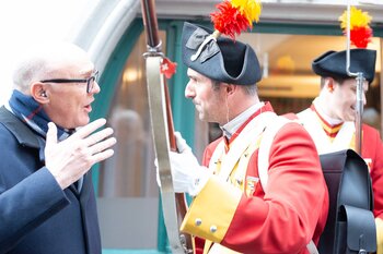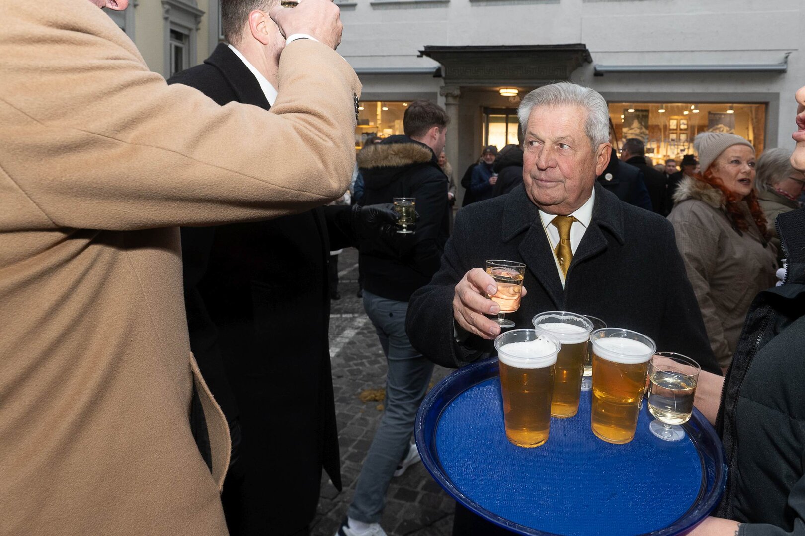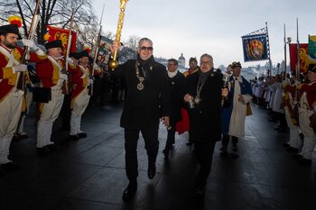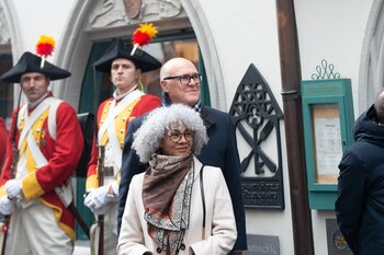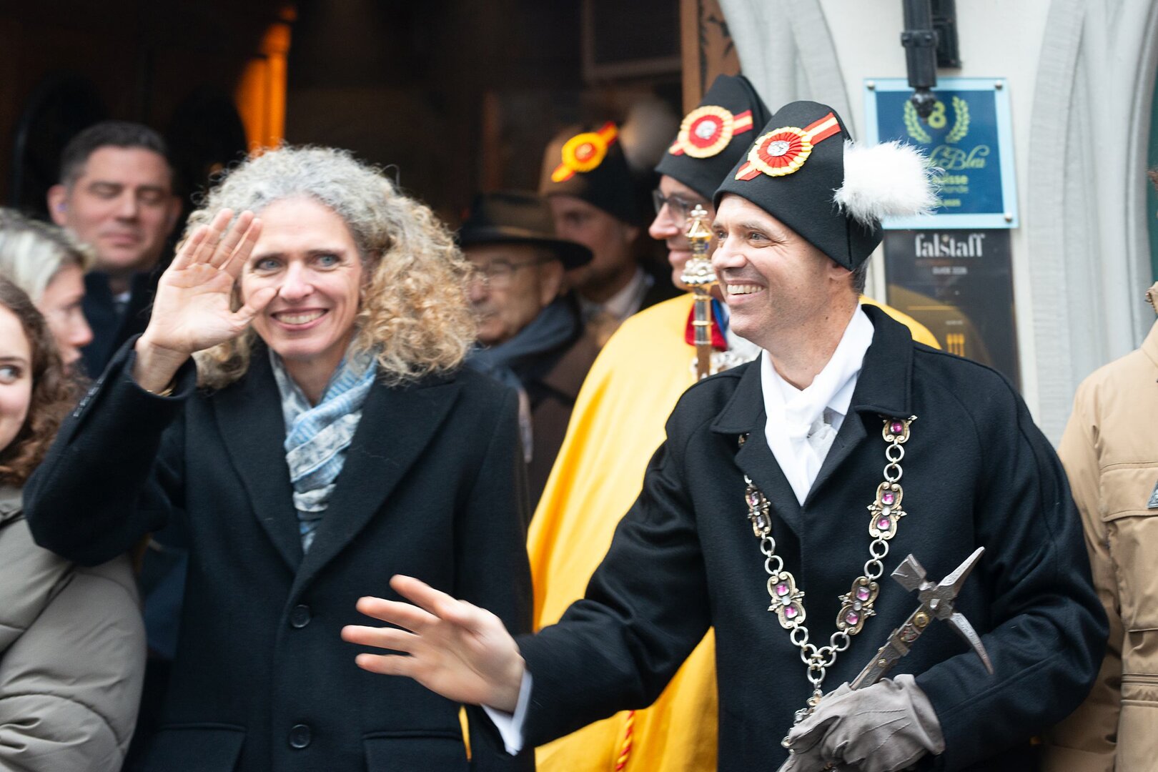 Auf dem Kapellplatz warteten bereits die Zunftgruppierungen: die strammen Grenadiere, das Umzugskomitee sowie die als Waldmanndli bekannte Historische Zunftgruppe. Die Feldmusik spielte auf, Hunderte von Freunden und Bekannten jubelten dem Fritschivater 2026 zu. Für zusätzlichen Schwung sorgte der Zunftnarr, der stilecht mit dem Lastenvelo auf den Kapellplatz rollte und das Publikum lautstark zum «Brüeleee» animierte. Nach einem ersten Umzug durch die Altstadt führte der Weg in den Wilden Mann. Dort fand mit der «Aufwartung» beim Zunftmeister der eigentliche Kern der Abholung statt. Rund zwei Dutzend Gruppen – vom Neuzünftler-Jahrgang über Vergnügungskomitees bis hin zu Delegationen aus Wirtschaft, Vereinigungen und weiteren Kreisen – überbrachten ihre Glückwünsche, meist mit viel Witz und Charme.