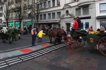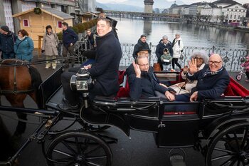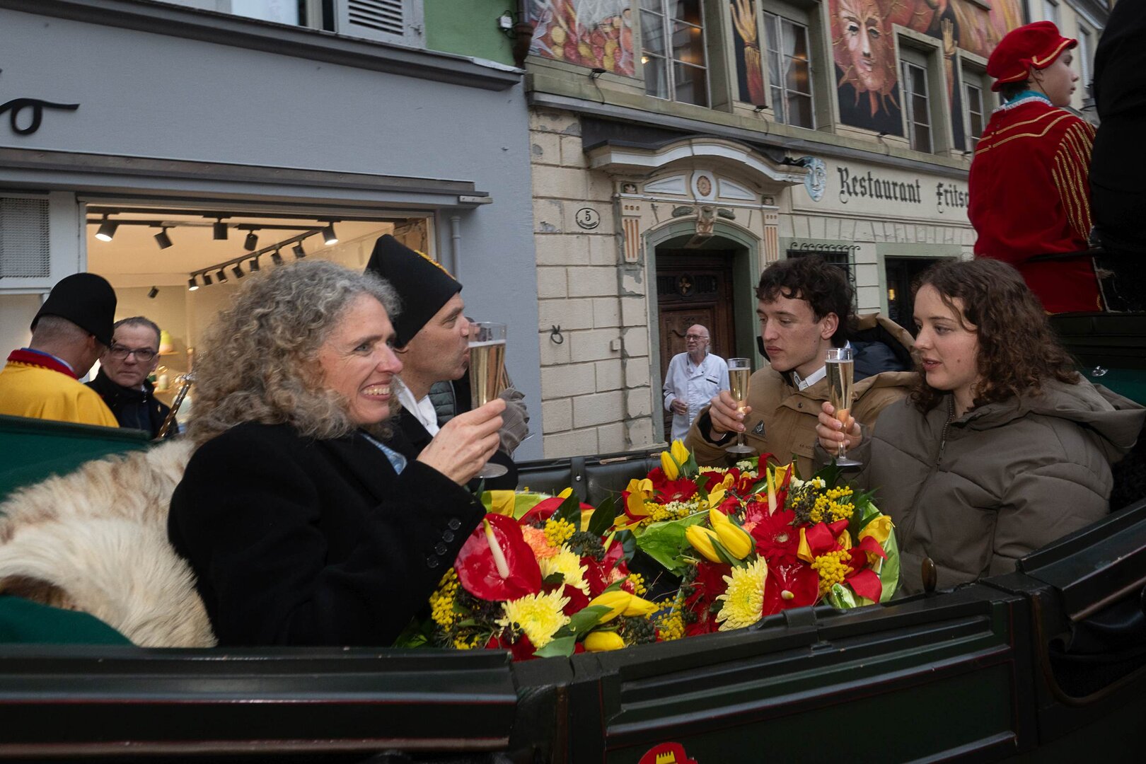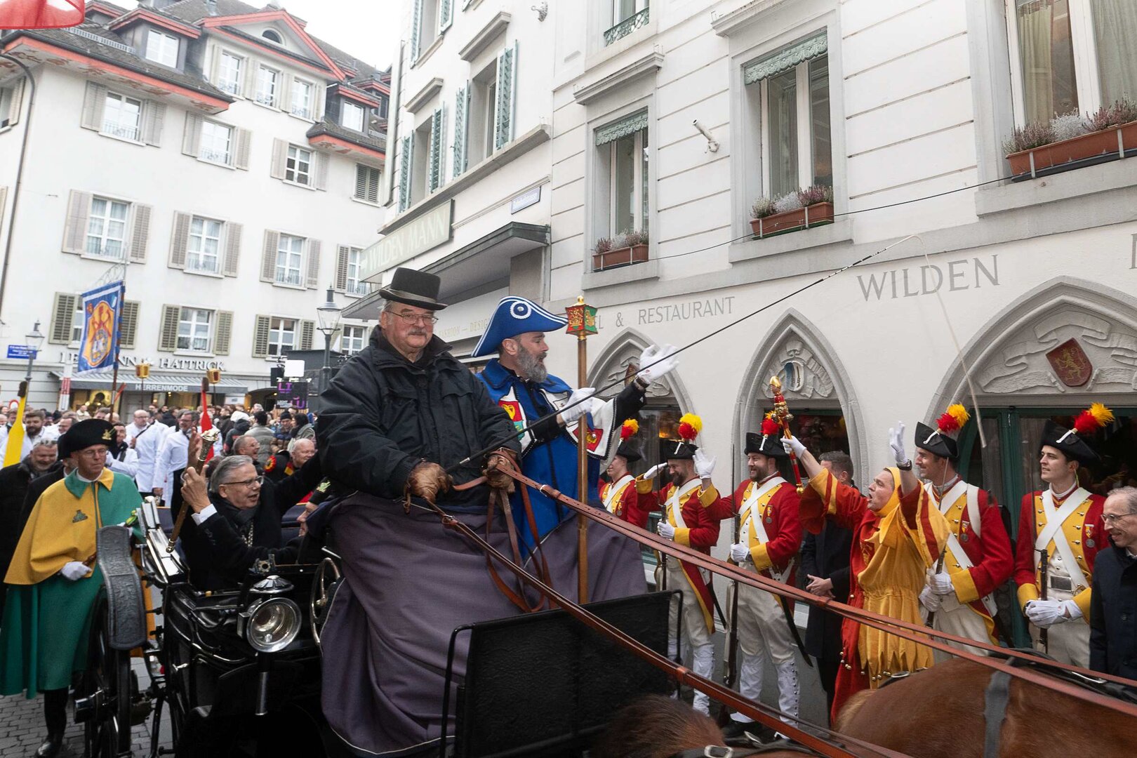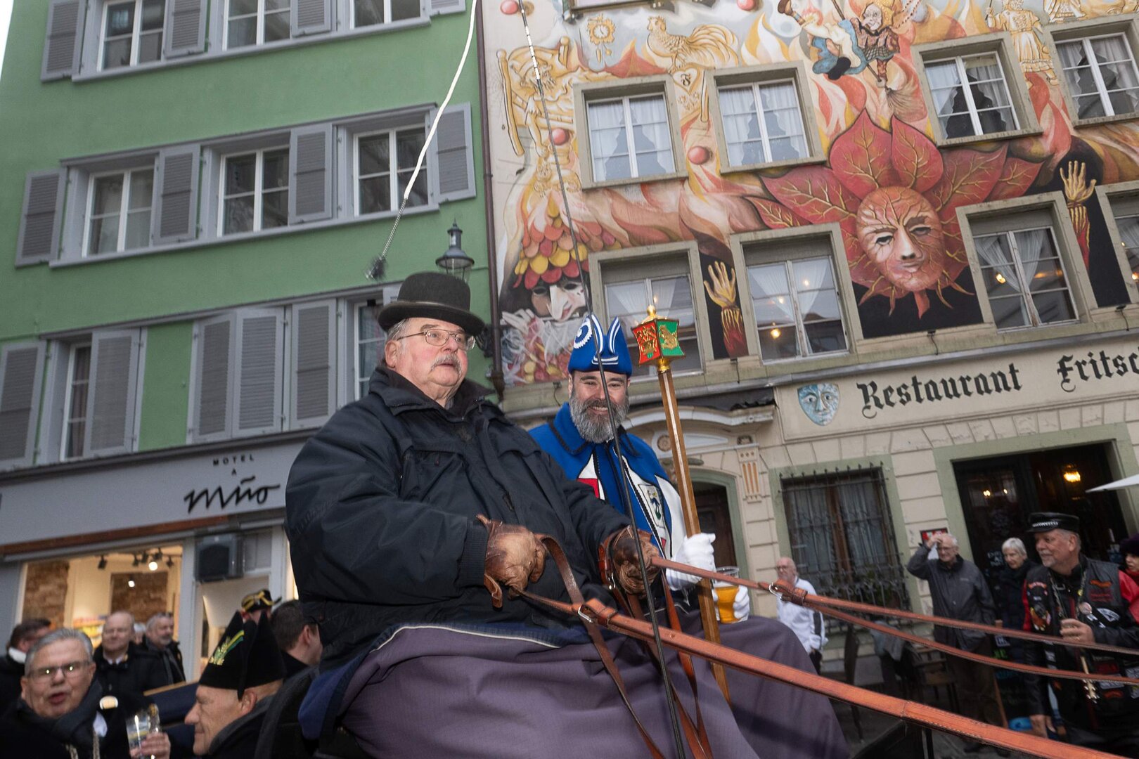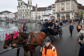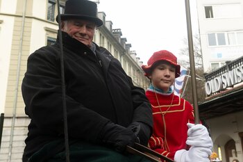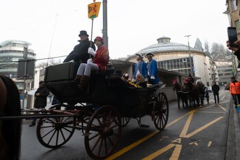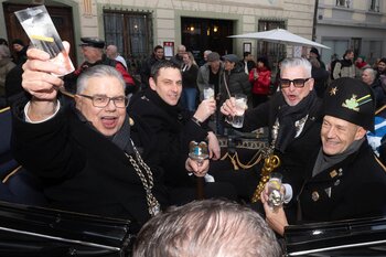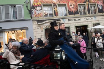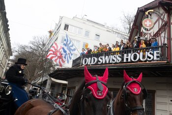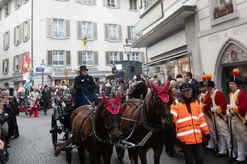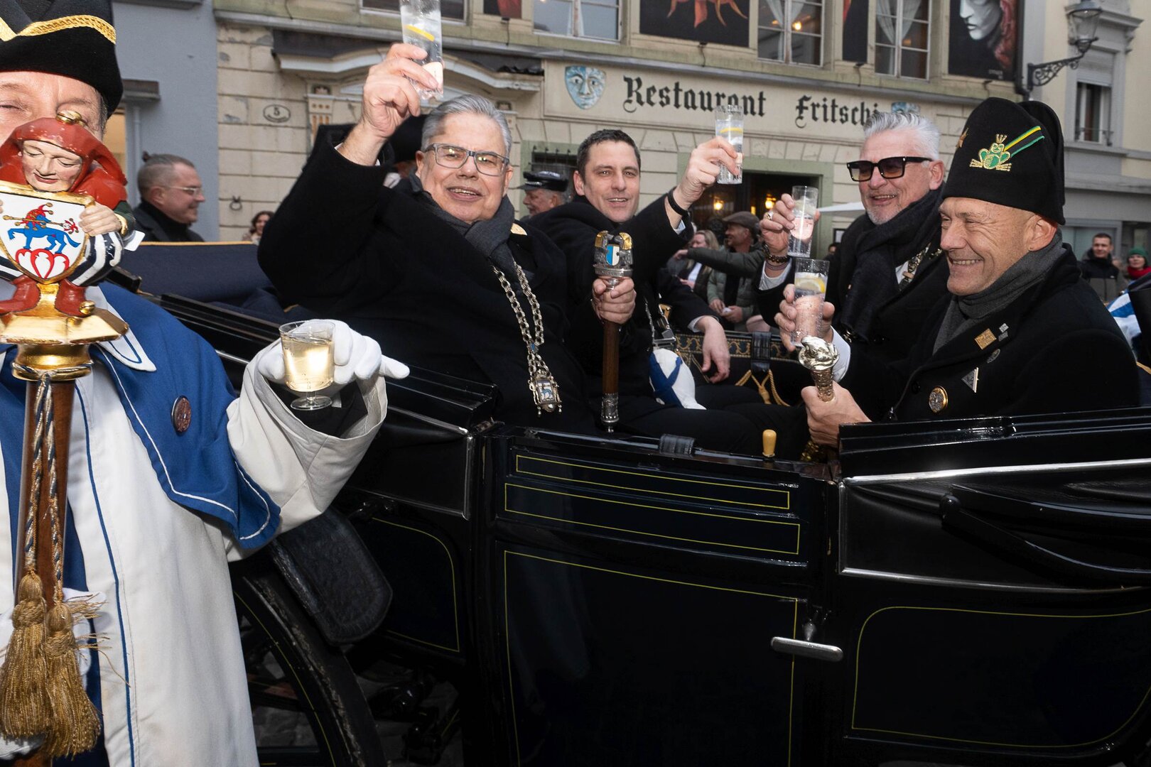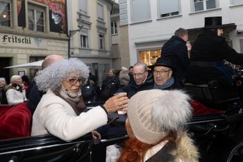 ph. Frühmorgens beginnt für den Fritschivater die Vorbereitung für das Bärteliessen. Zusammen mit seiner Familie und dem Zunftrat traf sich Stefan Hug um 9 Uhr im Old Swiss House zum traditionellen Tafelspitz – die ideale Grundlage für einen langen Tag. Um halb elf ging es dann standesgemäss mit der Kutsche in Richtung Altstadt.