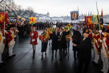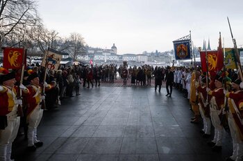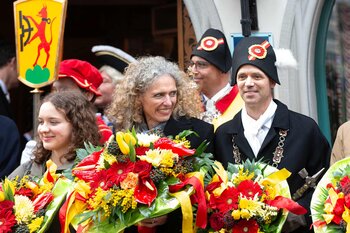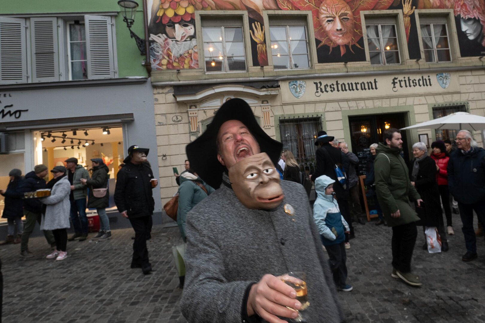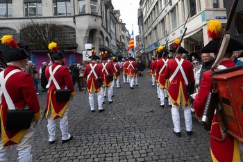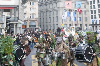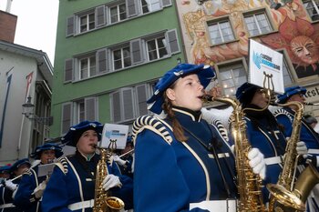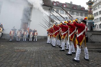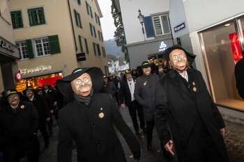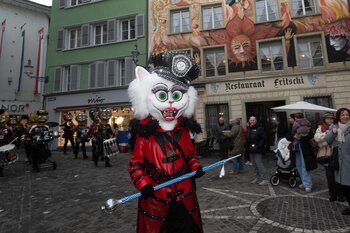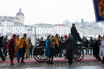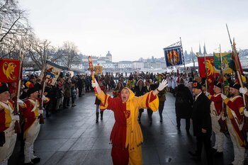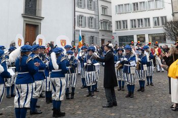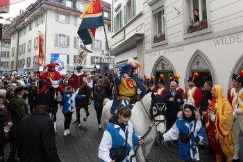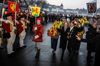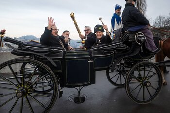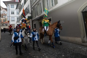 Zwei Wochen nach dem Bot der Zunft zu Safran gehört die Bühne dem Fritschivater: Mit der traditionellen «Abholung» zeigt er sich der Öffentlichkeit und lässt sich von Freunden aus Zünften, Gesellschaften, Vereinigungen und der Wirtschaft gebührend feiern.