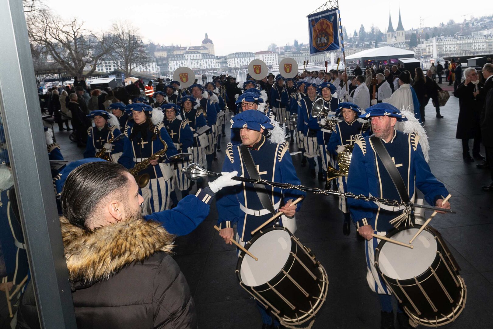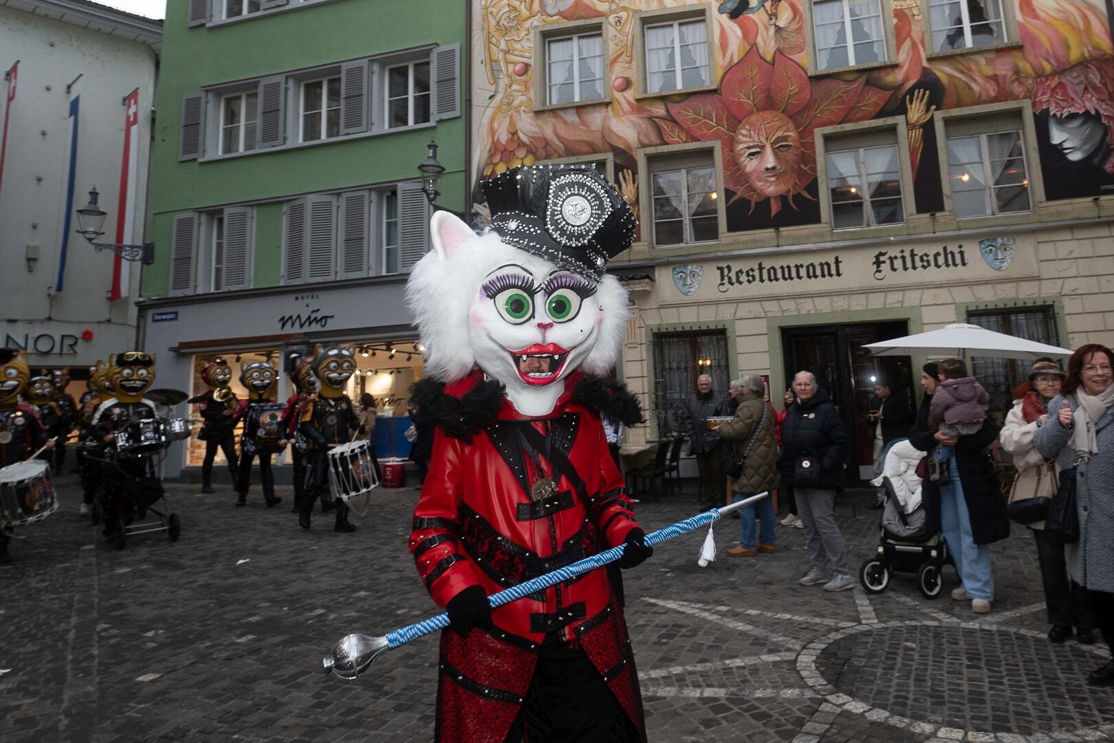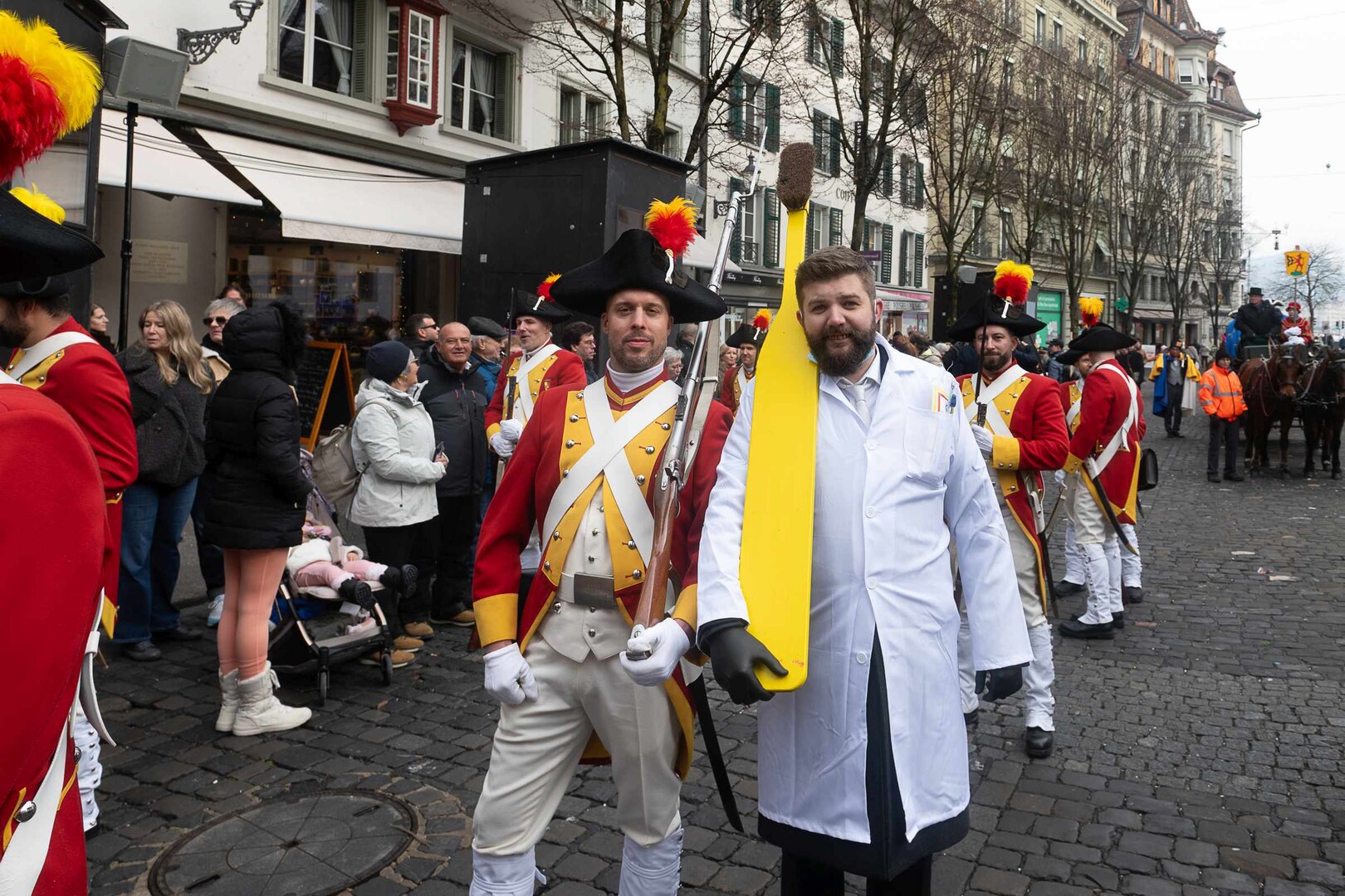 Beim anschliessenden Umzug durch die Altstadt stach vor allem die grosse, farbenprächtige Delegation der LFK-Huereaffe gemeinsam mit zahlreichen Alt-Herren ins Auge. Begleitet von der Lozärner Original Guggenmusig und der Chatzemusig Lozärn zog der Tross weiter zum fast schon überlebenswichtigen Halt im Stadtkeller – Gehopftes und Gekelltertes inklusive. Grossartig, liebe Stadtkeller-Crew! Beim KKL wurde der Fritschivater schliesslich von den Zünftlern der Zunft zu Safran empfangen, allen voran vom stets sorgenfreien VKP Tobias Moser. Die traditionelle Fritschipastete, gehaltvolle Ansprachen des Zunftmeisters sowie seiner Ehrengäste – Bundesrat Martin Pfister, Coop-CEO Philipp Wyss und der Zunftmeister zu Hottigen, Anders Mathis – und diverse Ehrungen verliehen dem Anlass seinen würdevollen Rahmen. Ein weiteres Highlight bildete das rund einstündige Theater des VK26.