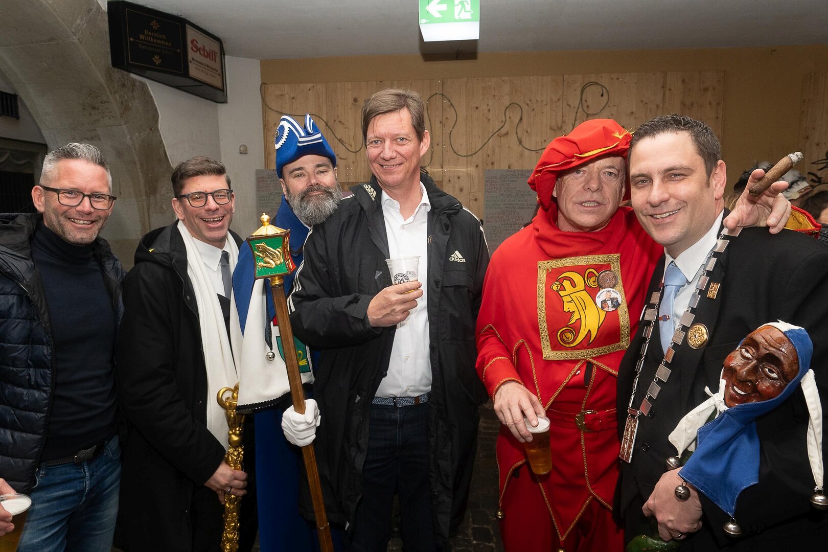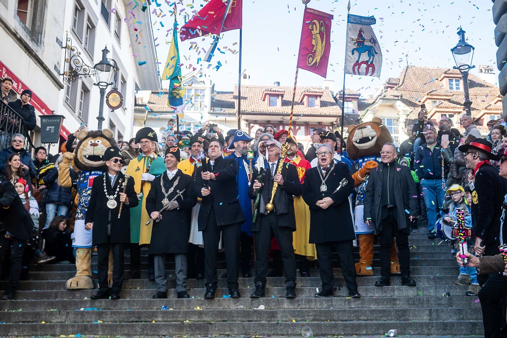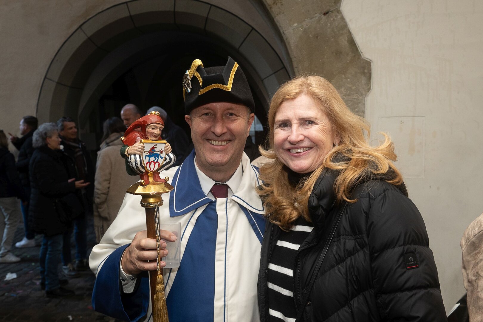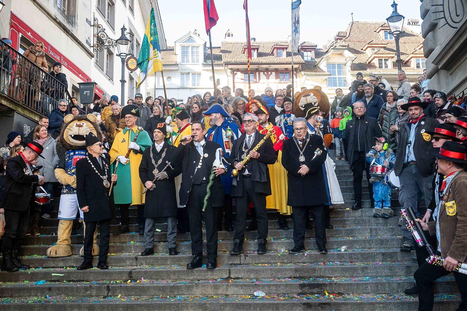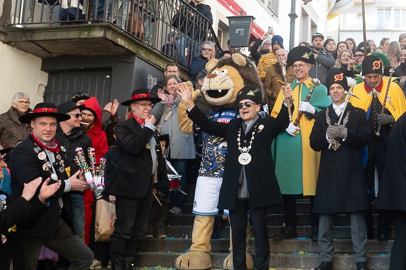 Um 15:30 Uhr folgte dann der Höhepunkt auf der Rathaustreppe, wo sich die Fasnachtsgewaltigen versammelten. In würdigem Rahmen und begleitet von zahlreichen Zuschauerinnen und Zuschauern wurde dort ein ganz besonderes Jubiläum zelebriert: