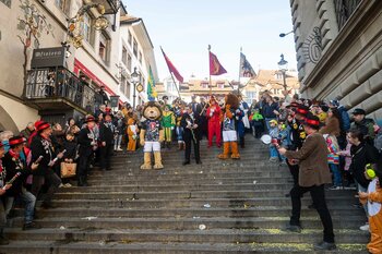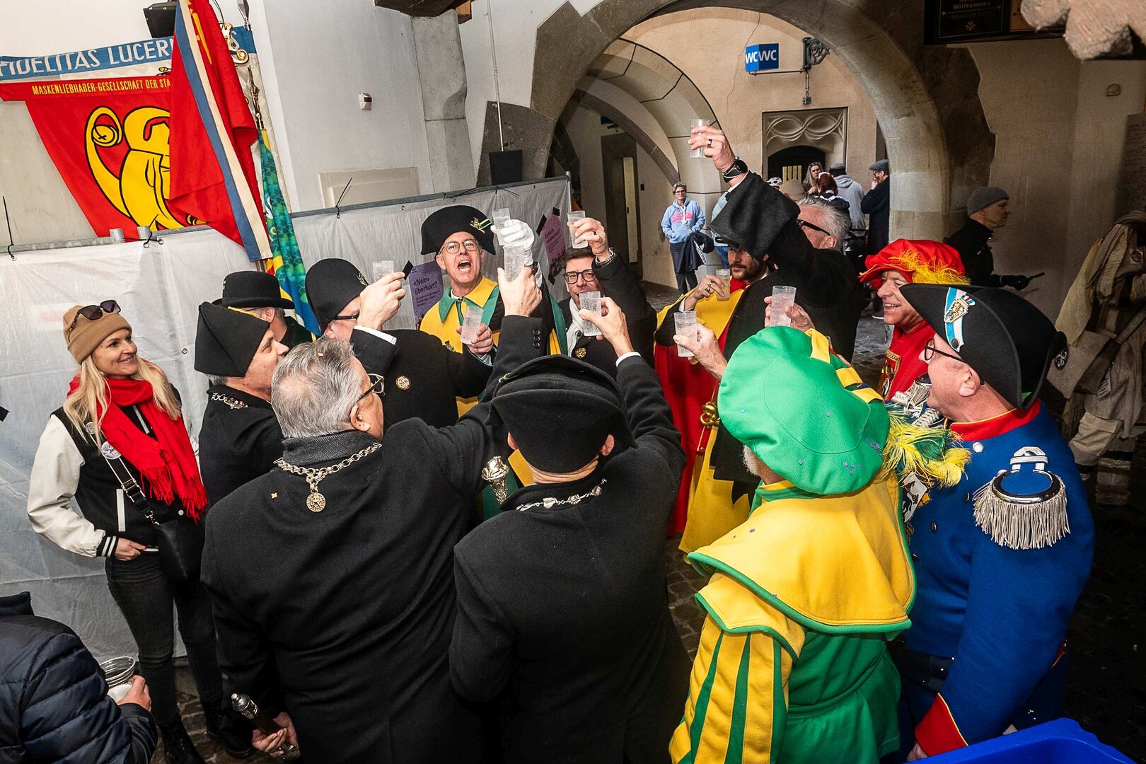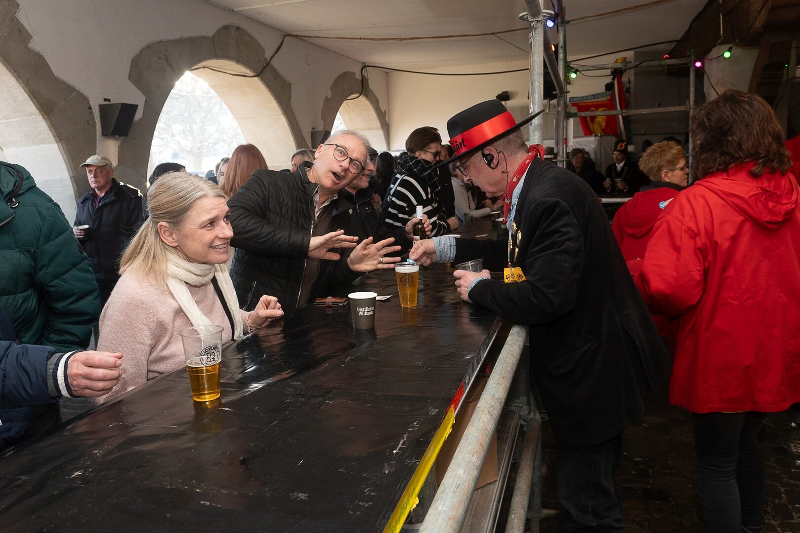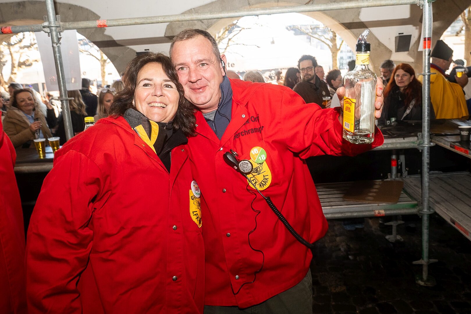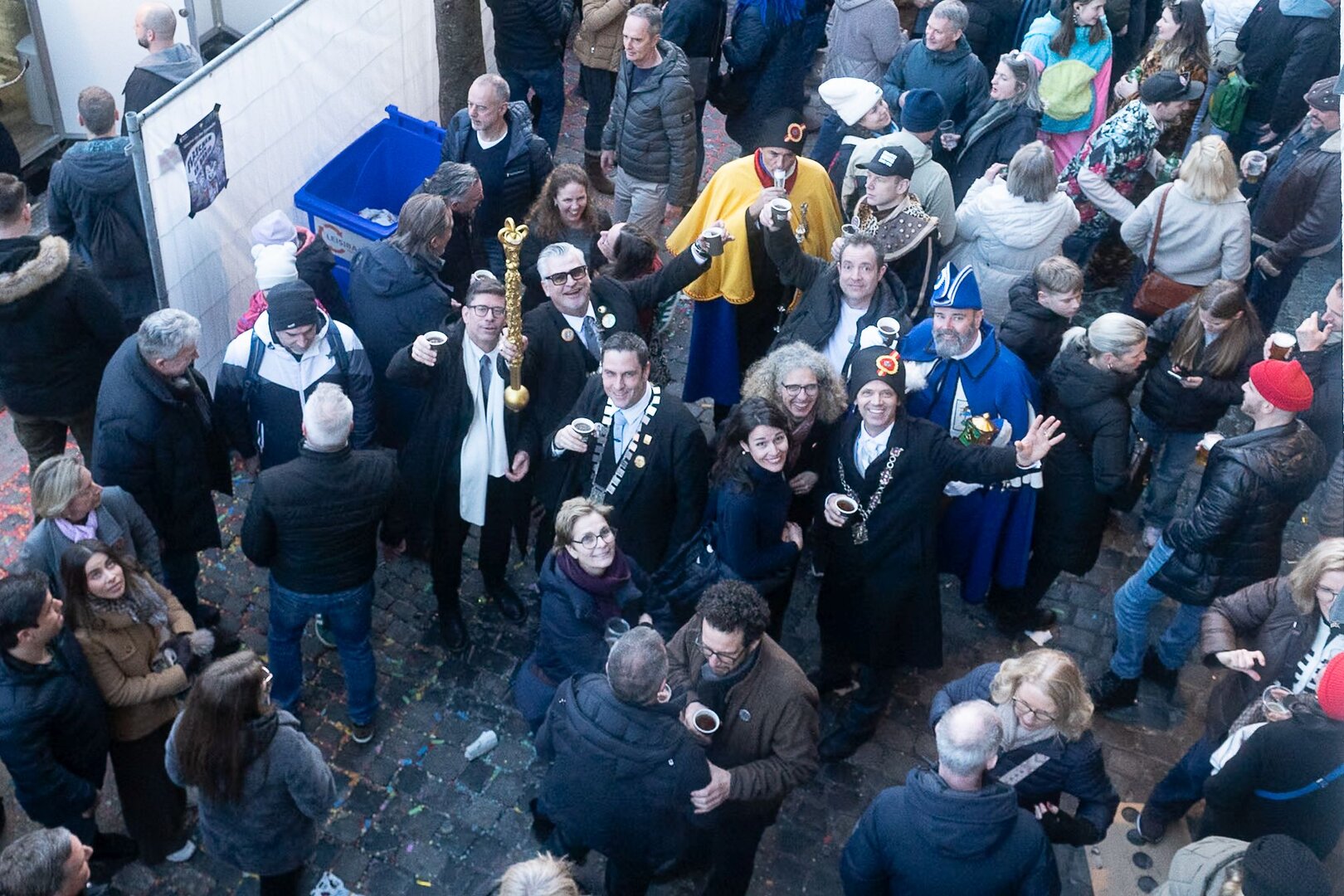 Um 15:30 Uhr folgte dann der Höhepunkt auf der Rathaustreppe, wo sich die Fasnachtsgewaltigen versammelten. In würdigem Rahmen und begleitet von zahlreichen Zuschauerinnen und Zuschauern wurde dort ein ganz besonderes Jubiläum zelebriert: