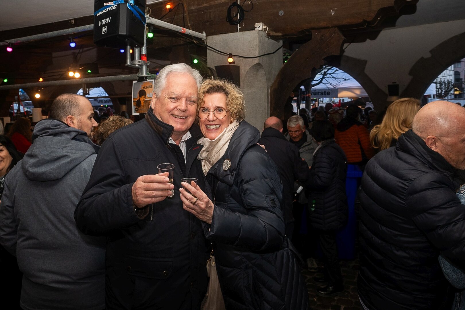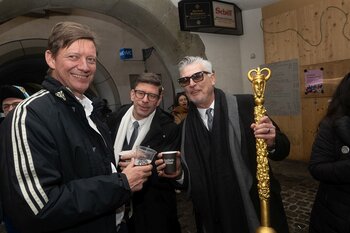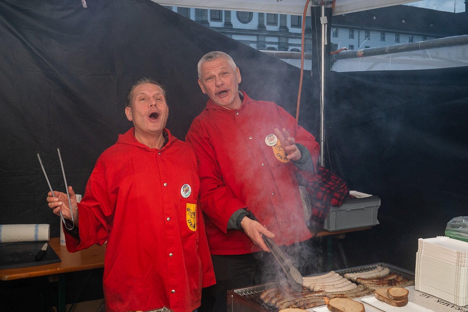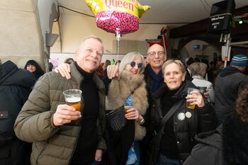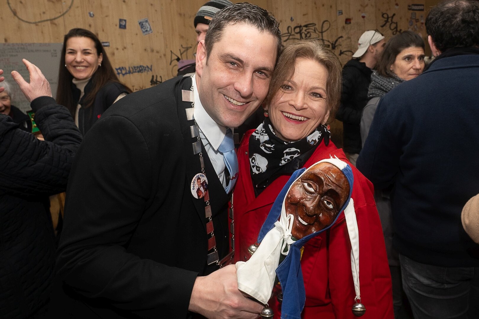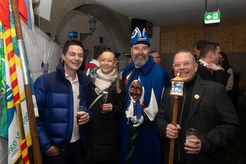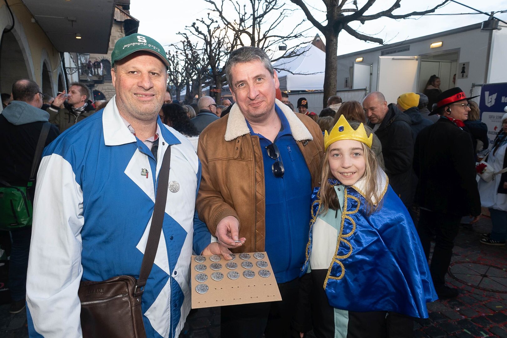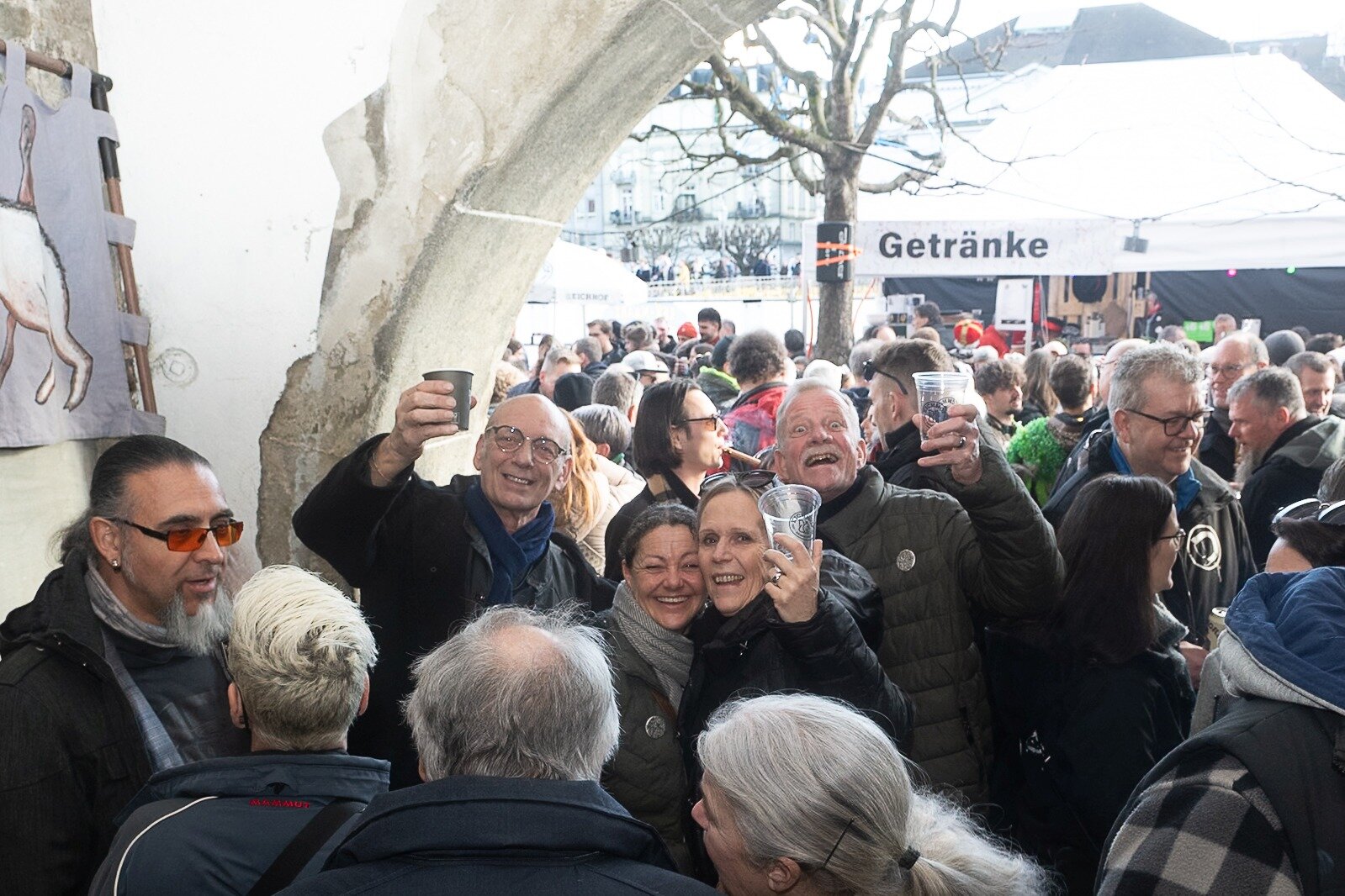 Um 15:30 Uhr folgte dann der Höhepunkt auf der Rathaustreppe, wo sich die Fasnachtsgewaltigen versammelten. In würdigem Rahmen und begleitet von zahlreichen Zuschauerinnen und Zuschauern wurde dort ein ganz besonderes Jubiläum zelebriert: