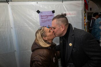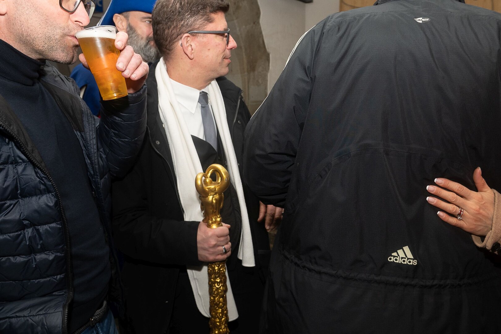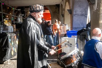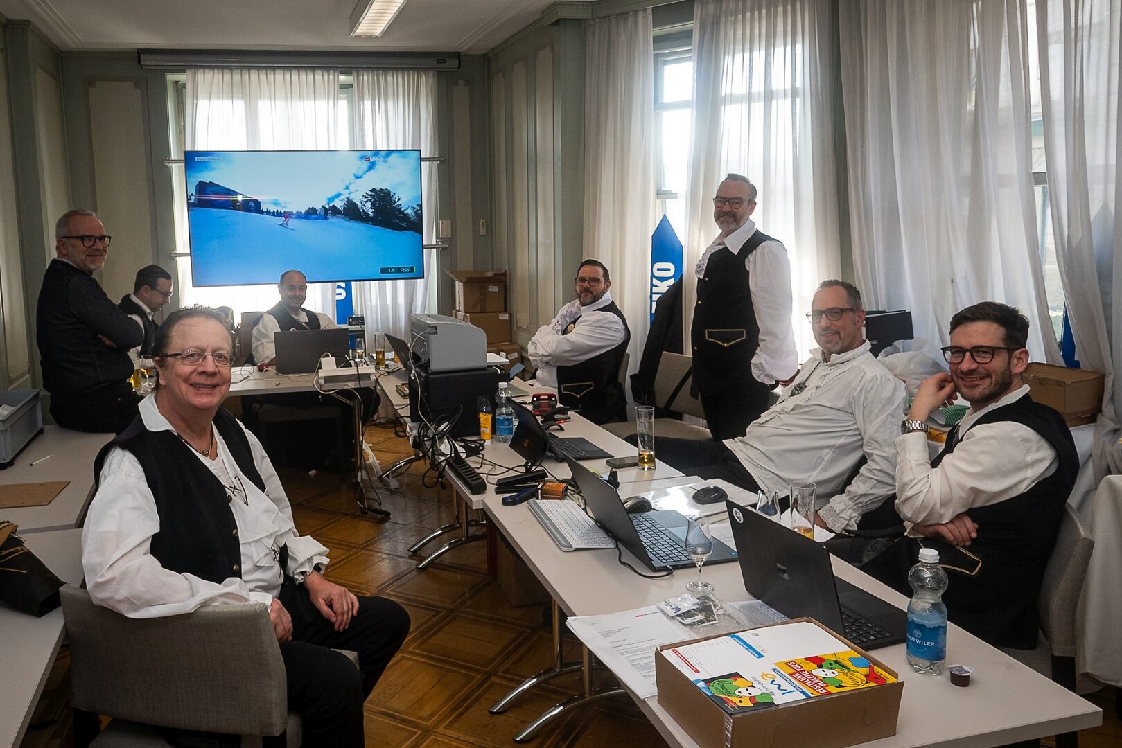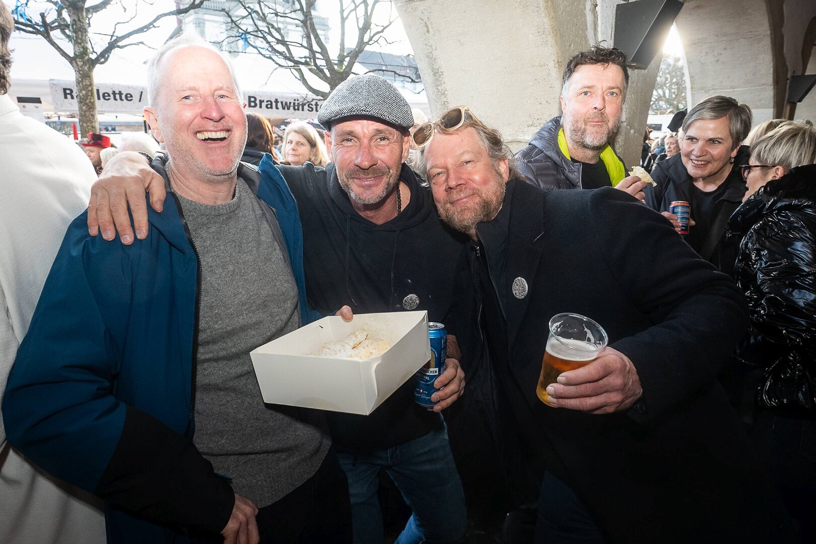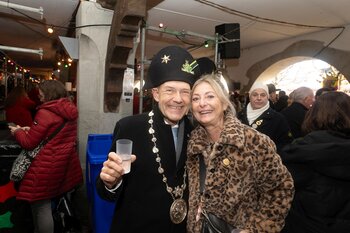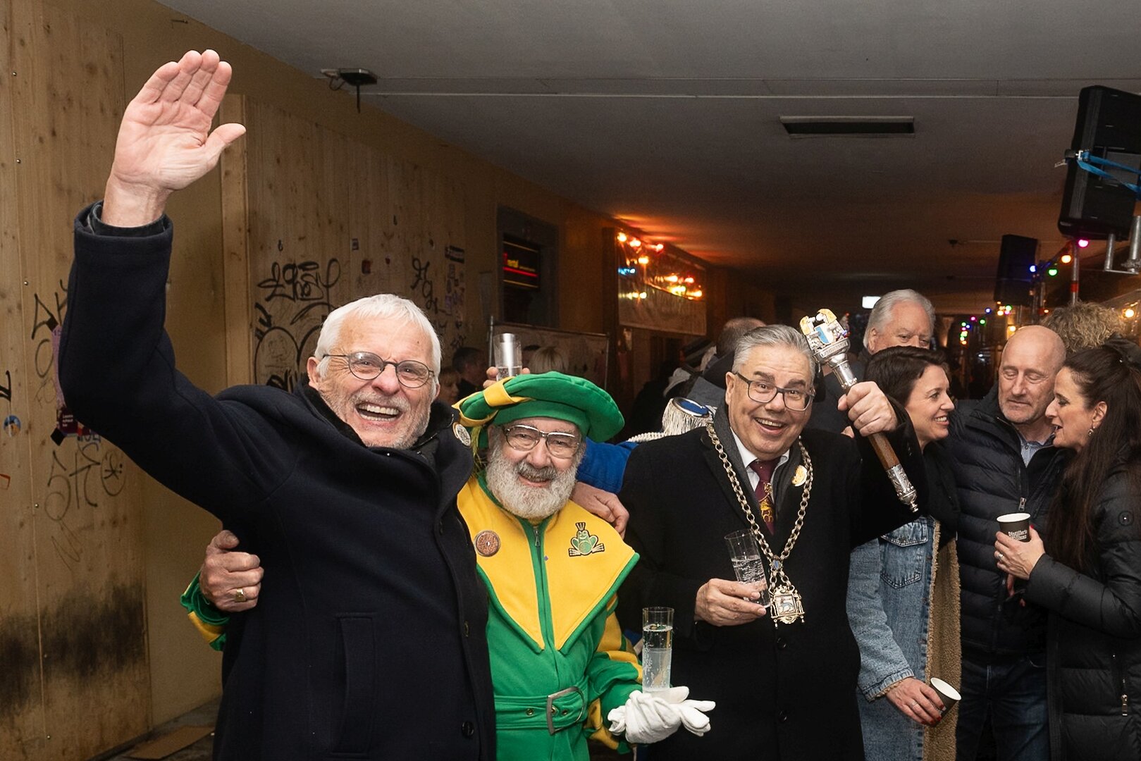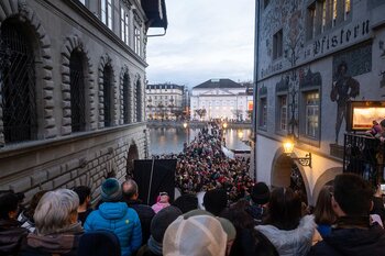 Um 15:30 Uhr folgte dann der Höhepunkt auf der Rathaustreppe, wo sich die Fasnachtsgewaltigen versammelten. In würdigem Rahmen und begleitet von zahlreichen Zuschauerinnen und Zuschauern wurde dort ein ganz besonderes Jubiläum zelebriert: