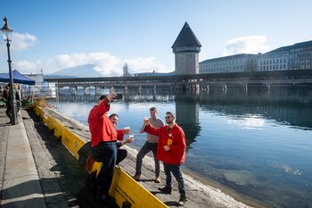 Die beiden Jubiläen standen sinnbildlich für das, was Luzern ausmacht: gelebte Tradition, Gemeinschaft und Leidenschaft – getragen von den gemeinsamen Farben in blau-weiss. Passend zu diesem besonderen Anlass bot der Fasnachtsmäärt die ideale Bühne für die Präsentation des neuen Fasnachtstrikots des FC Luzern. Vor historischer Kulisse und mitten im närrischen Treiben wurde das Trikot der Öffentlichkeit gezeigt – ein starkes Zeichen für die enge Verbundenheit zwischen dem FCL und der Luzerner Fasnacht.Begleitet von Guuggenmusig-Klängen, fröhlichen Gesprächen und bester Stimmung wurde bis in die Abendstunden gefeiert. Der Fasnachtsmäärt 2026 zeigte eindrücklich, wie Traditionen weiterleben und gemeinsam weitergeschrieben werden. Aber lassen wir doch die Bilder sprechen….