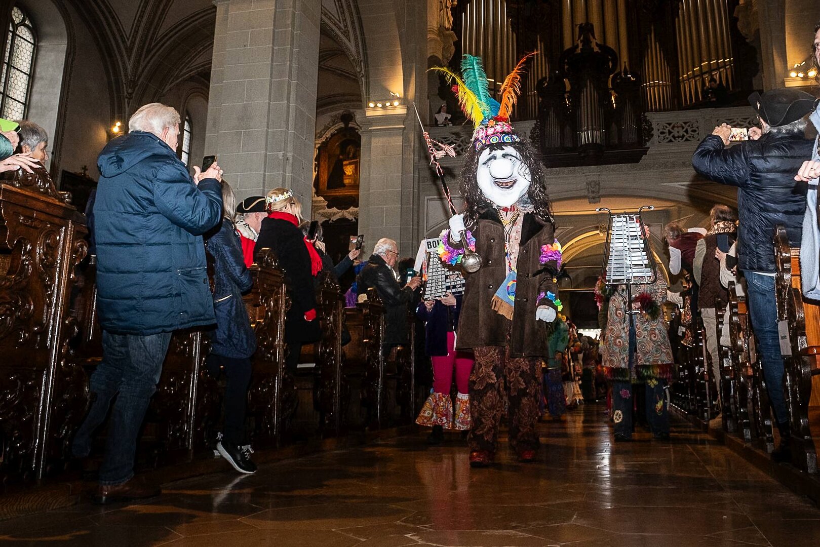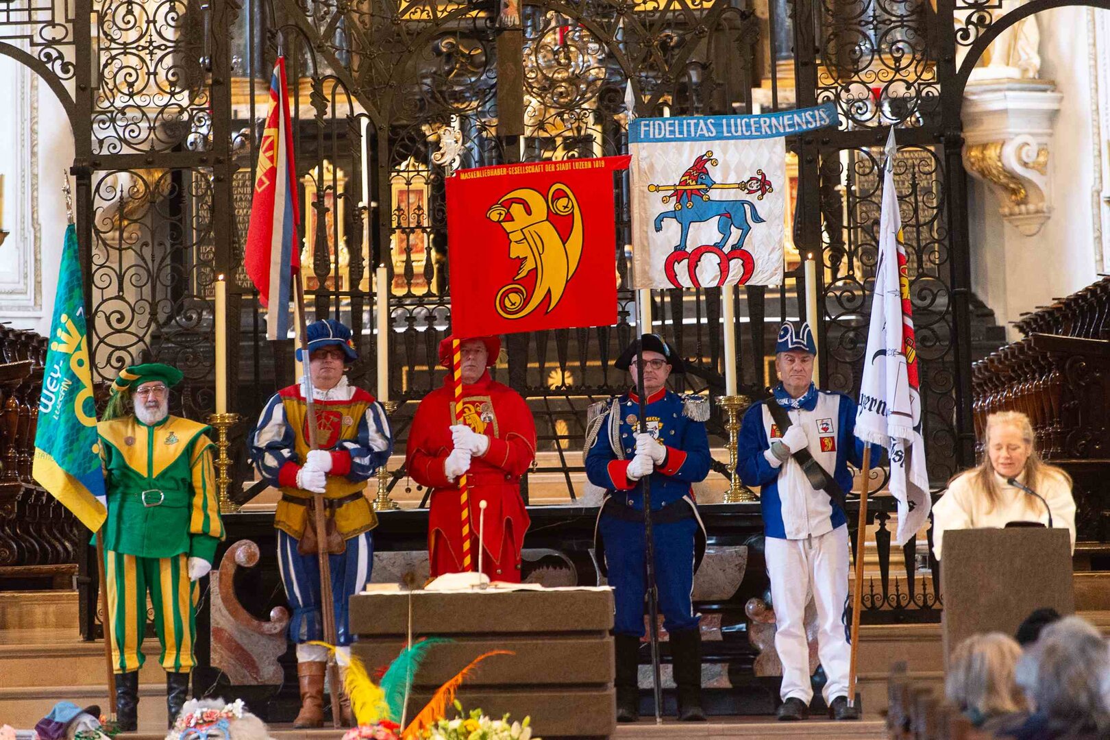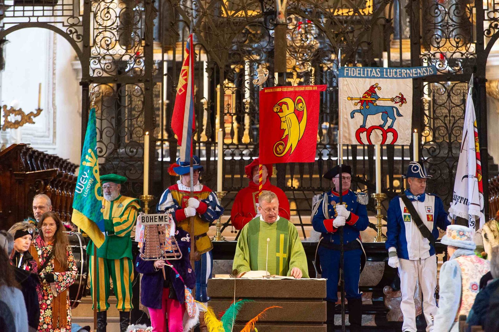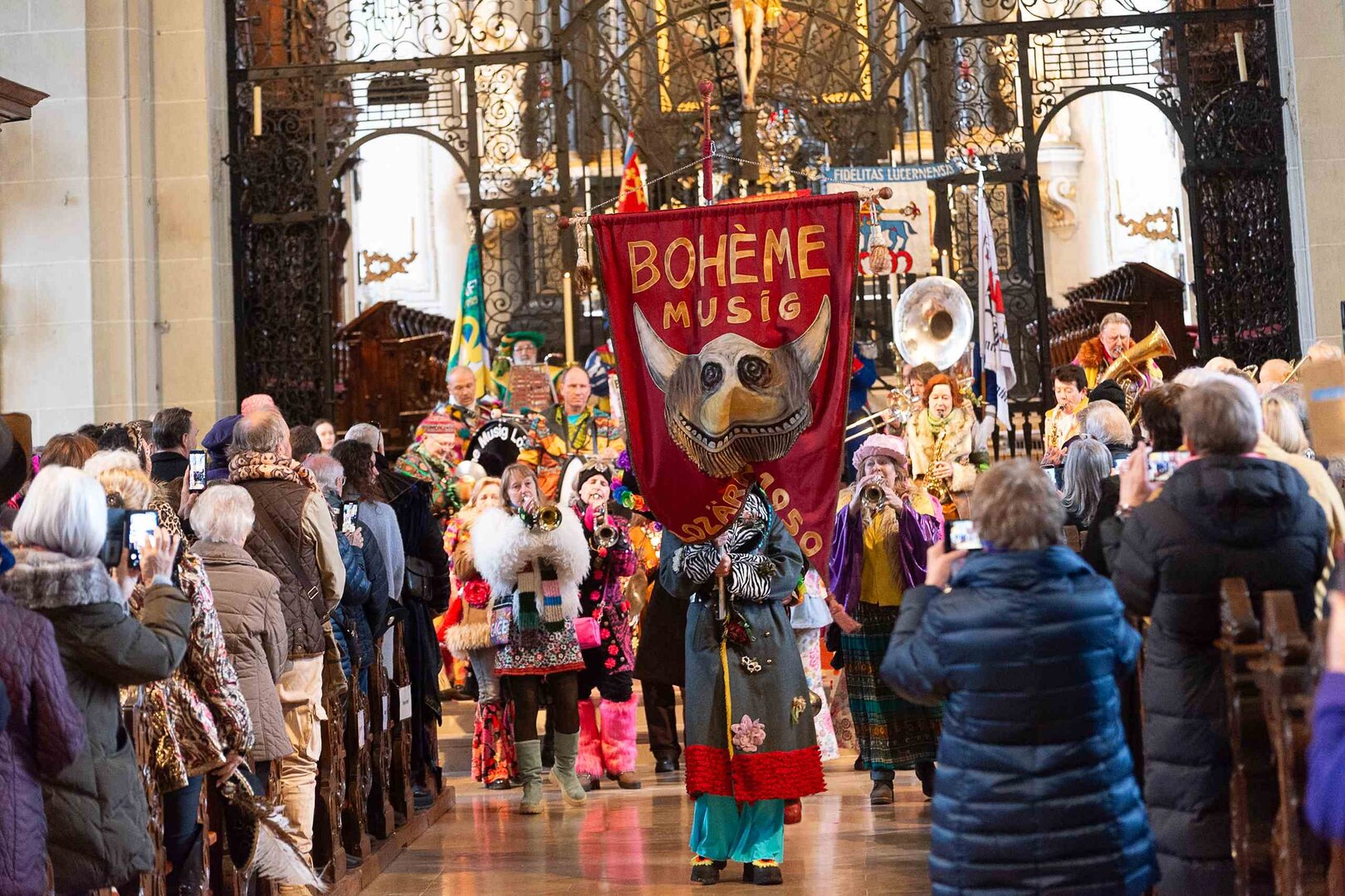 ph. Was für Klänge sind da in der Hofkirche zu hören? Wenn die Orgel auf die sanften Guuggerklänge der Guggenmusig treffen ertönt es in der Hofkirche wunderbar. Begleitet von Bohème Musig Lozärn marschierten die Meister und Präsidenten des LFK's in die Hofkirche ein. Auch wenn womöglich da und dort noch etwas müde Augen zu sehen waren, waren die ränge in der Hofkirche gut gefüllt. Am Sonntag die ideale Bedingungen etwas besinnliche Kraft zu tanken, bevor es dann am Güdismontag und Zischtig nochmals auf die Gassen geht.