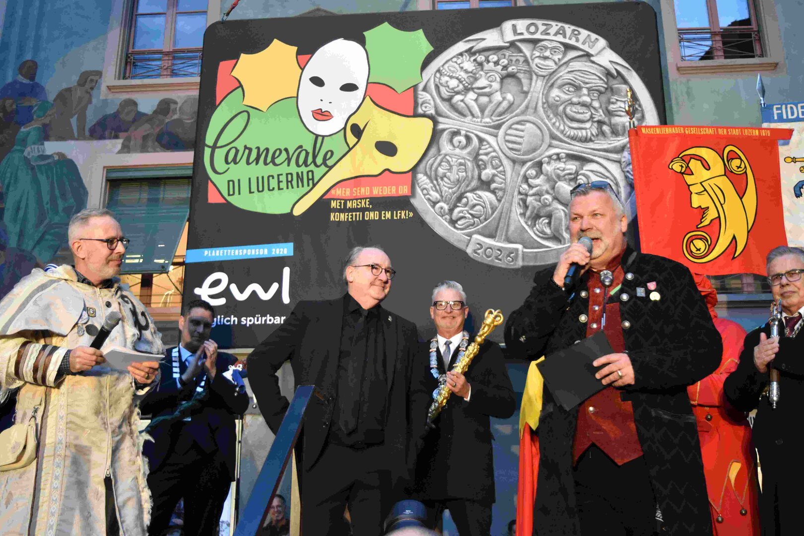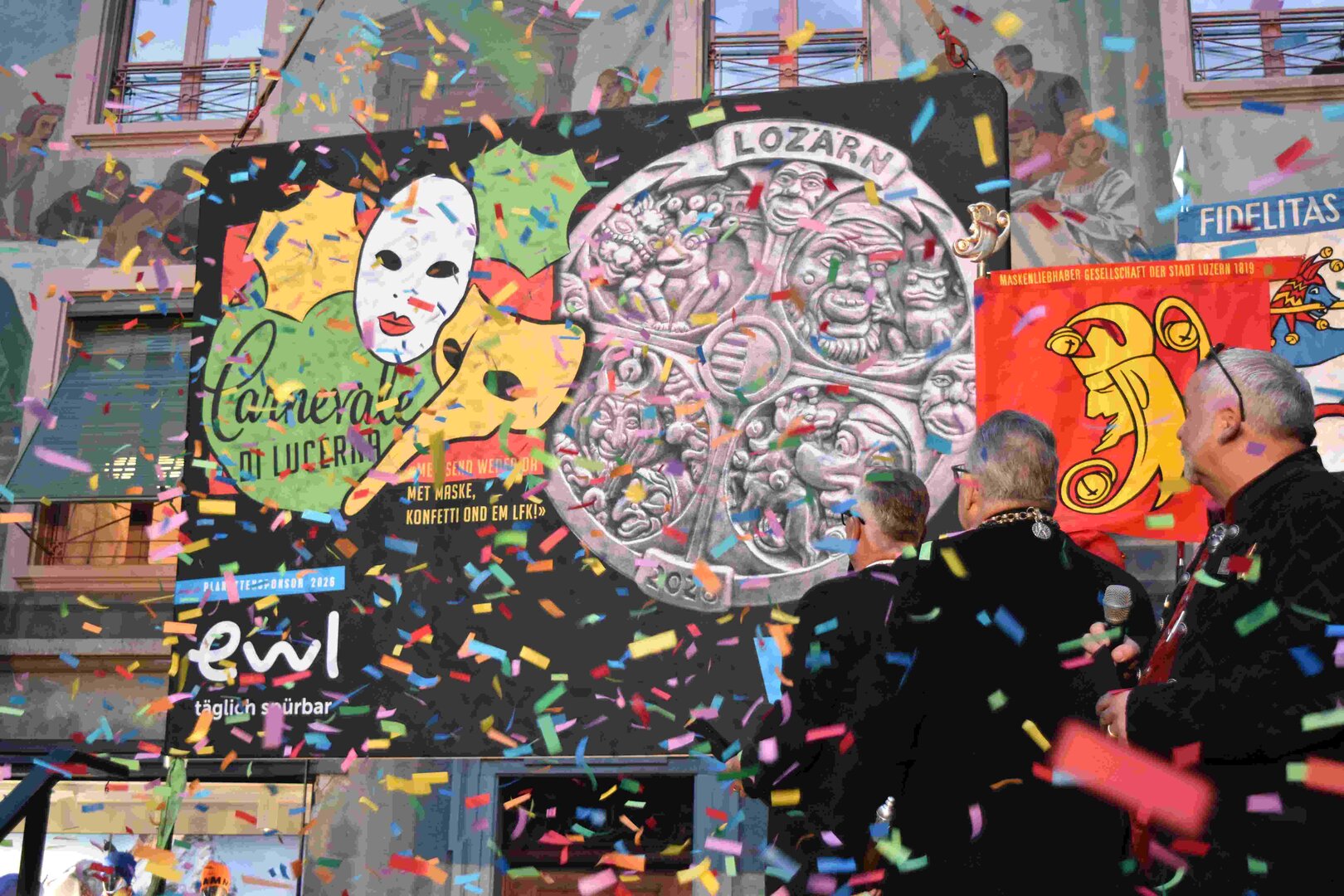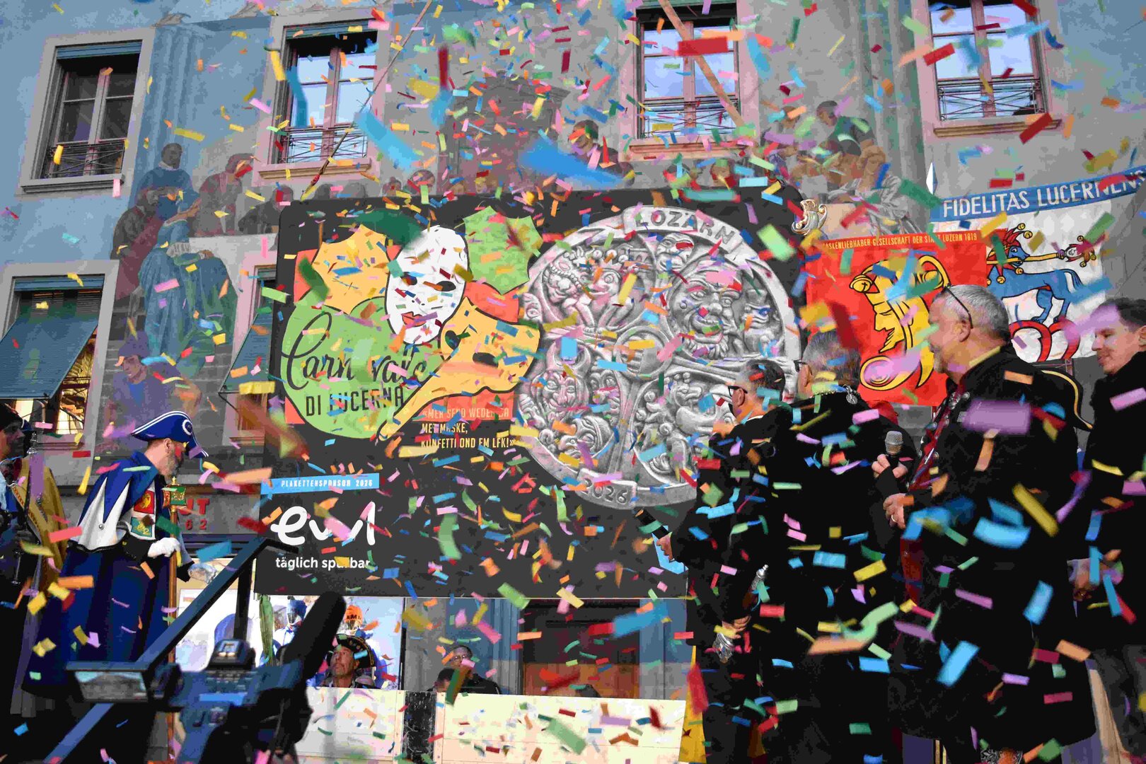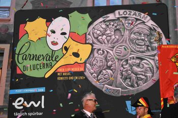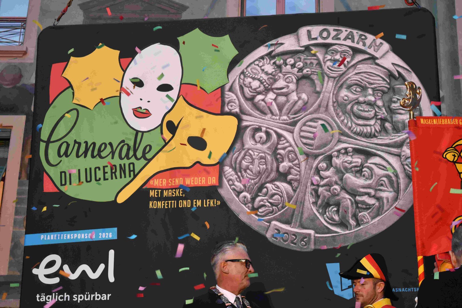 Zunächst wurde der Prägewerksponsor – die energie wasser luzern (EWL) geehrt. Anschliessend folgte die Würdigung der Zweit- und Drittplatzierten des Plakettenwettbewerbs. Und dann war der grosse Moment gekommen: Nach Trommelwirbel und einem improvisierten Fötzaliregen wurde sie enthüllt – die Fasnachtsplakette 2026, gestaltet vom renommierten Luzerner Künstler Basil Koch.