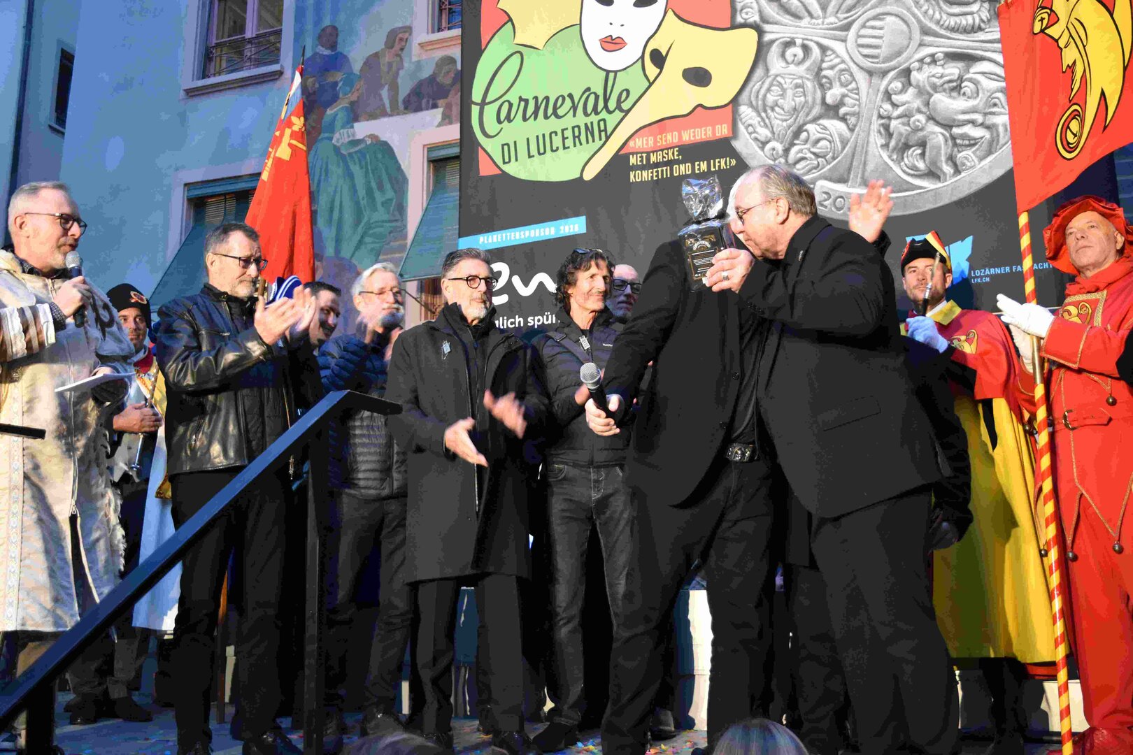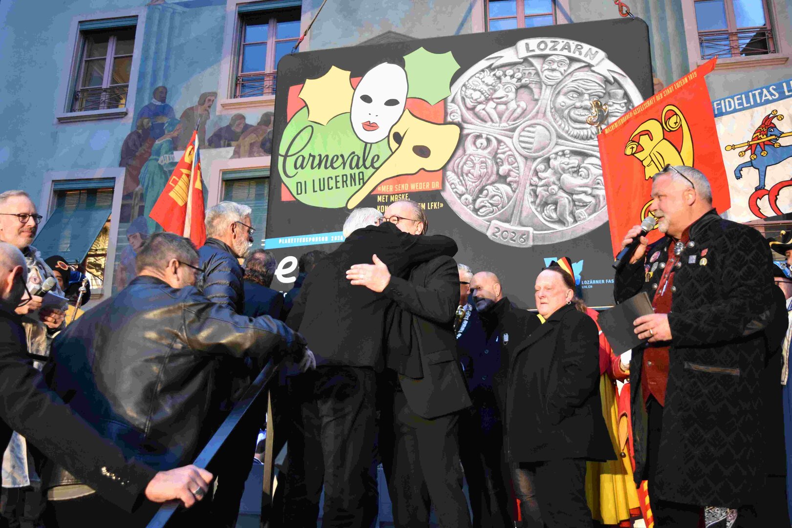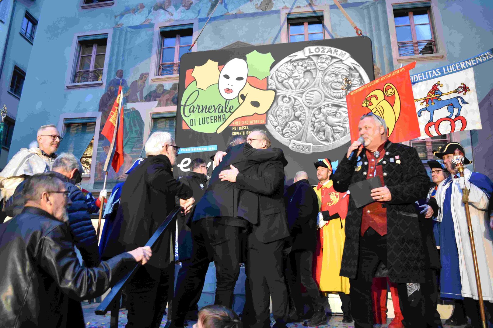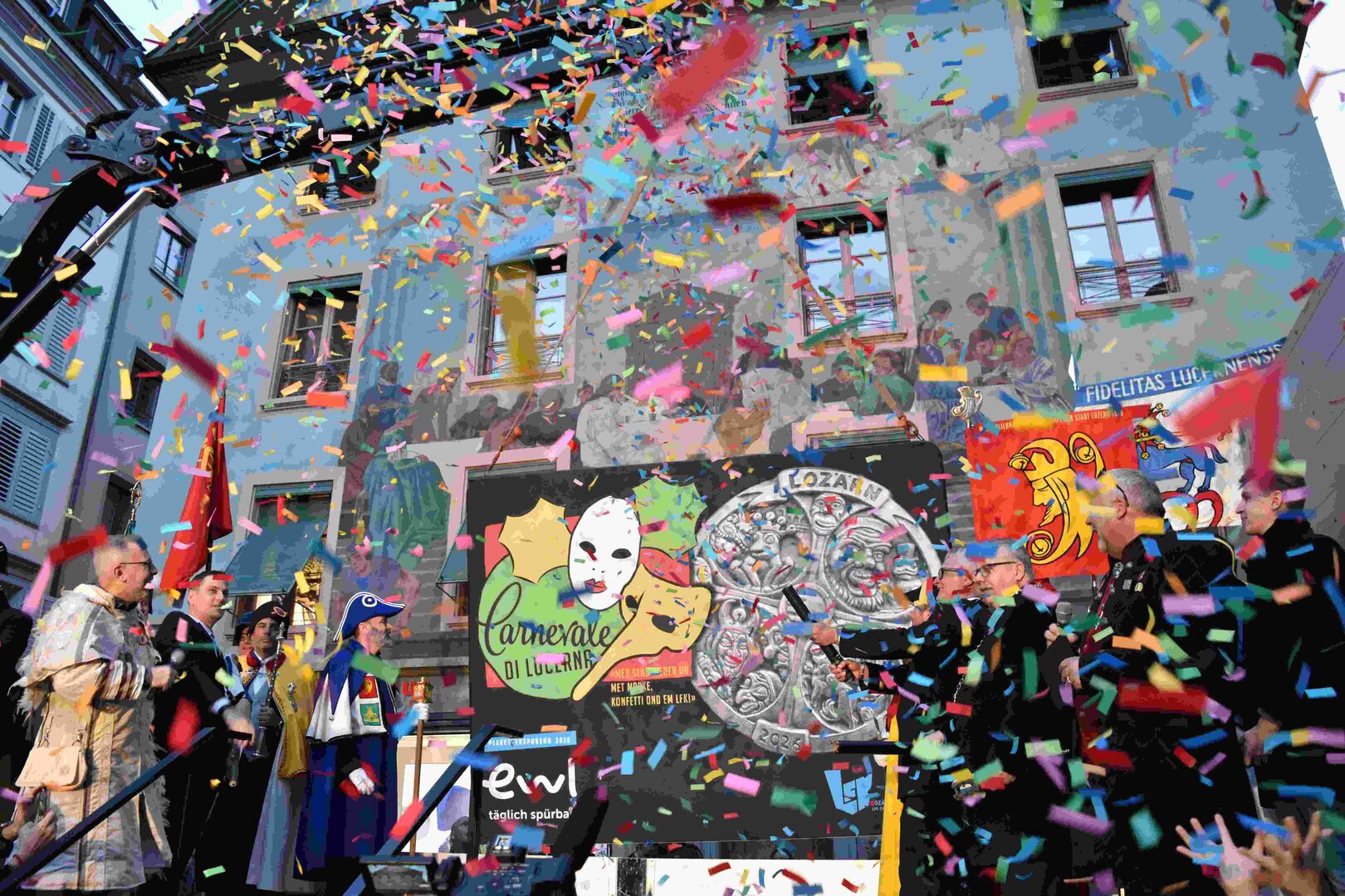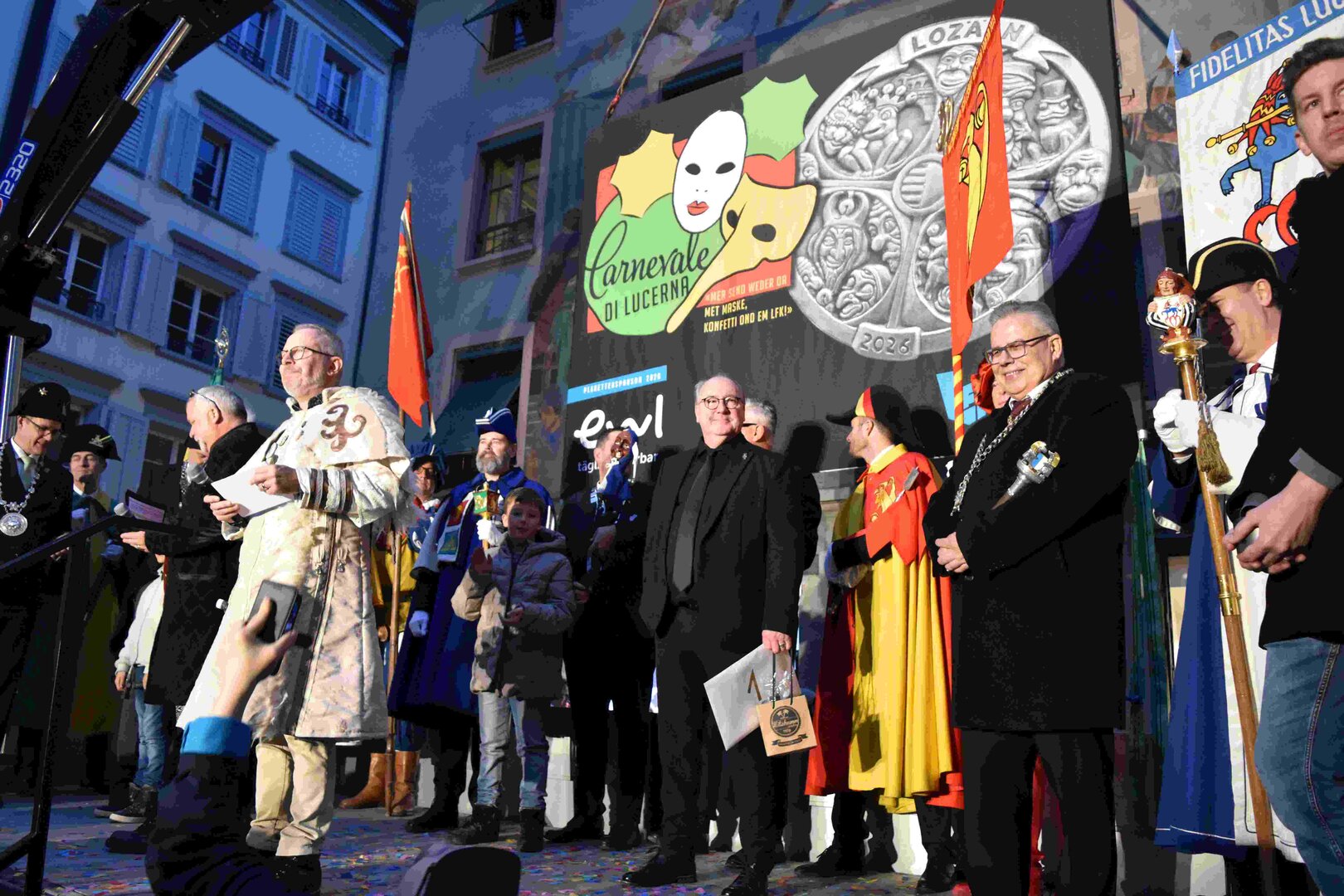 Zunächst wurde der Prägewerksponsor – die energie wasser luzern (EWL) geehrt. Anschliessend folgte die Würdigung der Zweit- und Drittplatzierten des Plakettenwettbewerbs. Und dann war der grosse Moment gekommen: Nach Trommelwirbel und einem improvisierten Fötzaliregen wurde sie enthüllt – die Fasnachtsplakette 2026, gestaltet vom renommierten Luzerner Künstler Basil Koch.