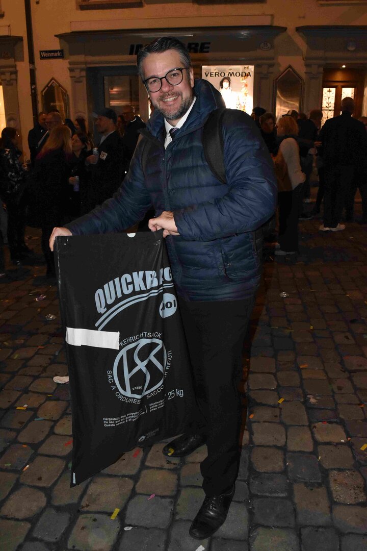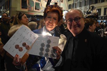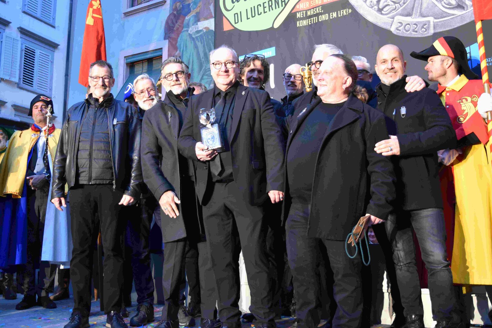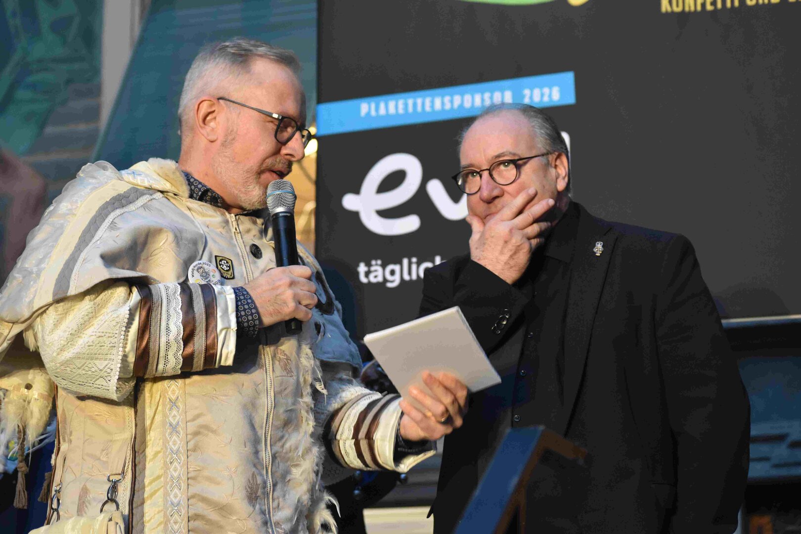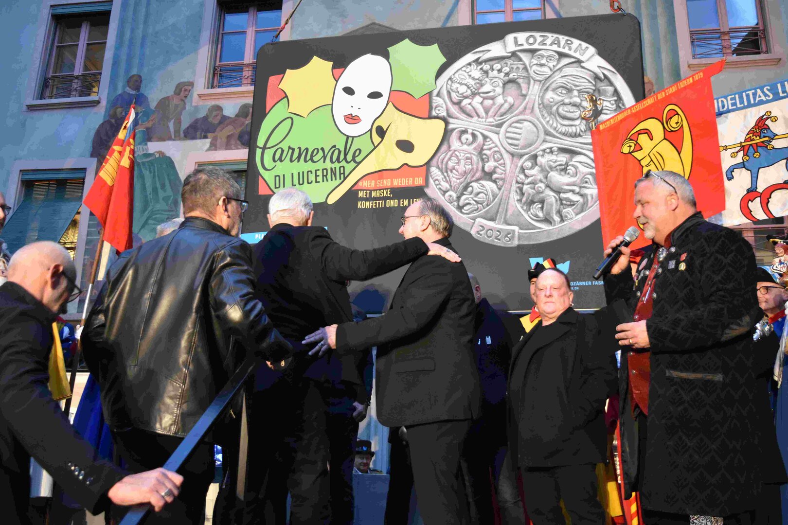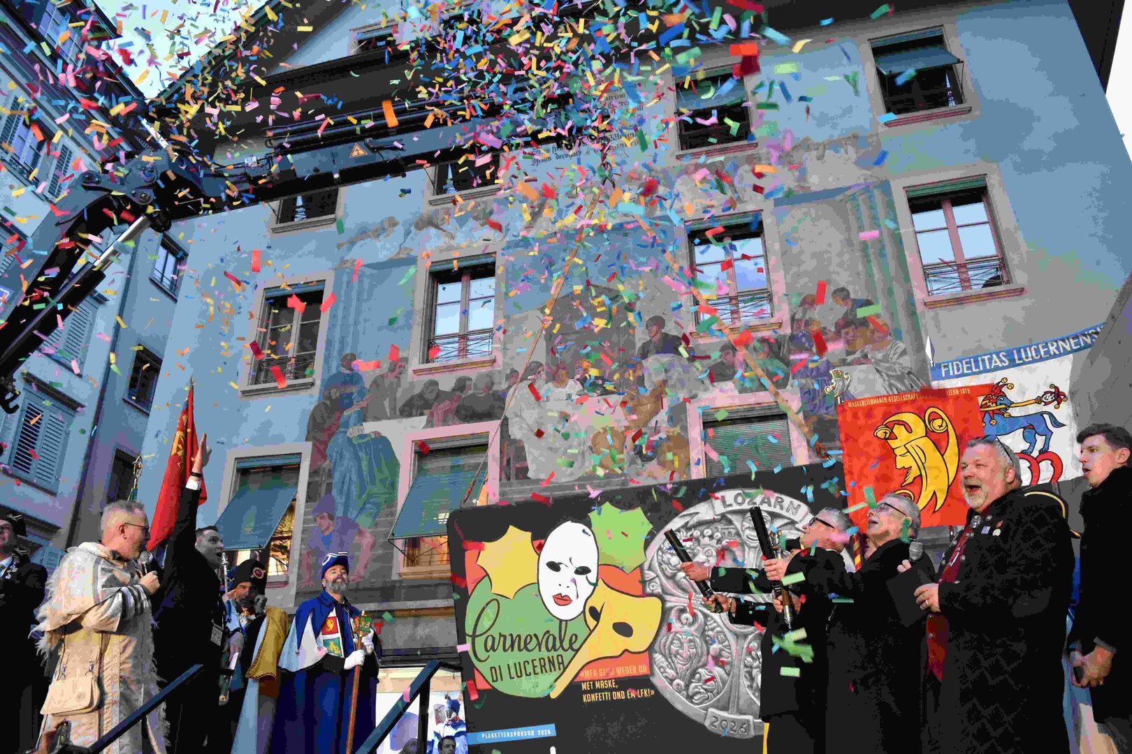 Zunächst wurde der Prägewerksponsor – die energie wasser luzern (EWL) geehrt. Anschliessend folgte die Würdigung der Zweit- und Drittplatzierten des Plakettenwettbewerbs. Und dann war der grosse Moment gekommen: Nach Trommelwirbel und einem improvisierten Fötzaliregen wurde sie enthüllt – die Fasnachtsplakette 2026, gestaltet vom renommierten Luzerner Künstler Basil Koch.