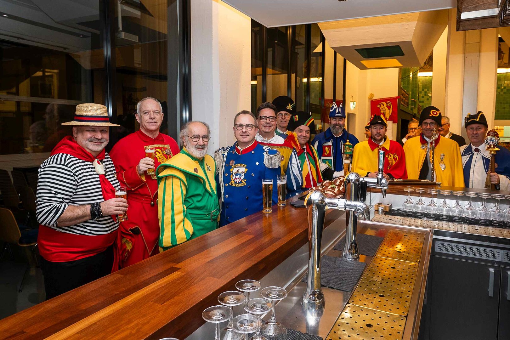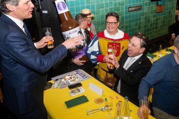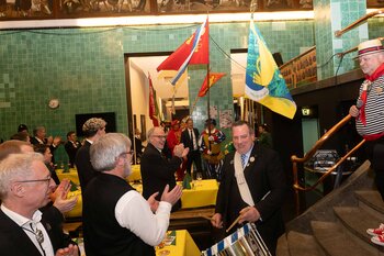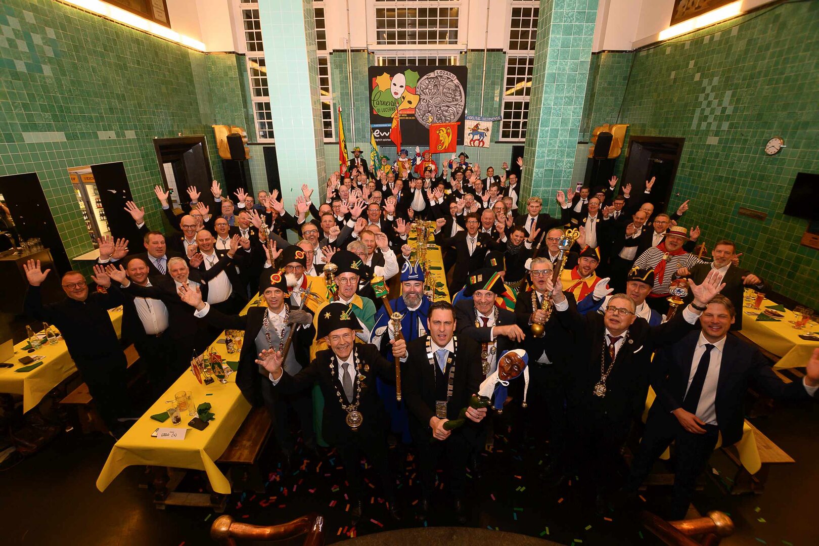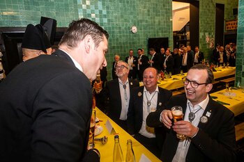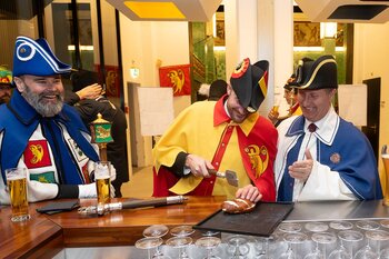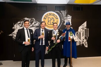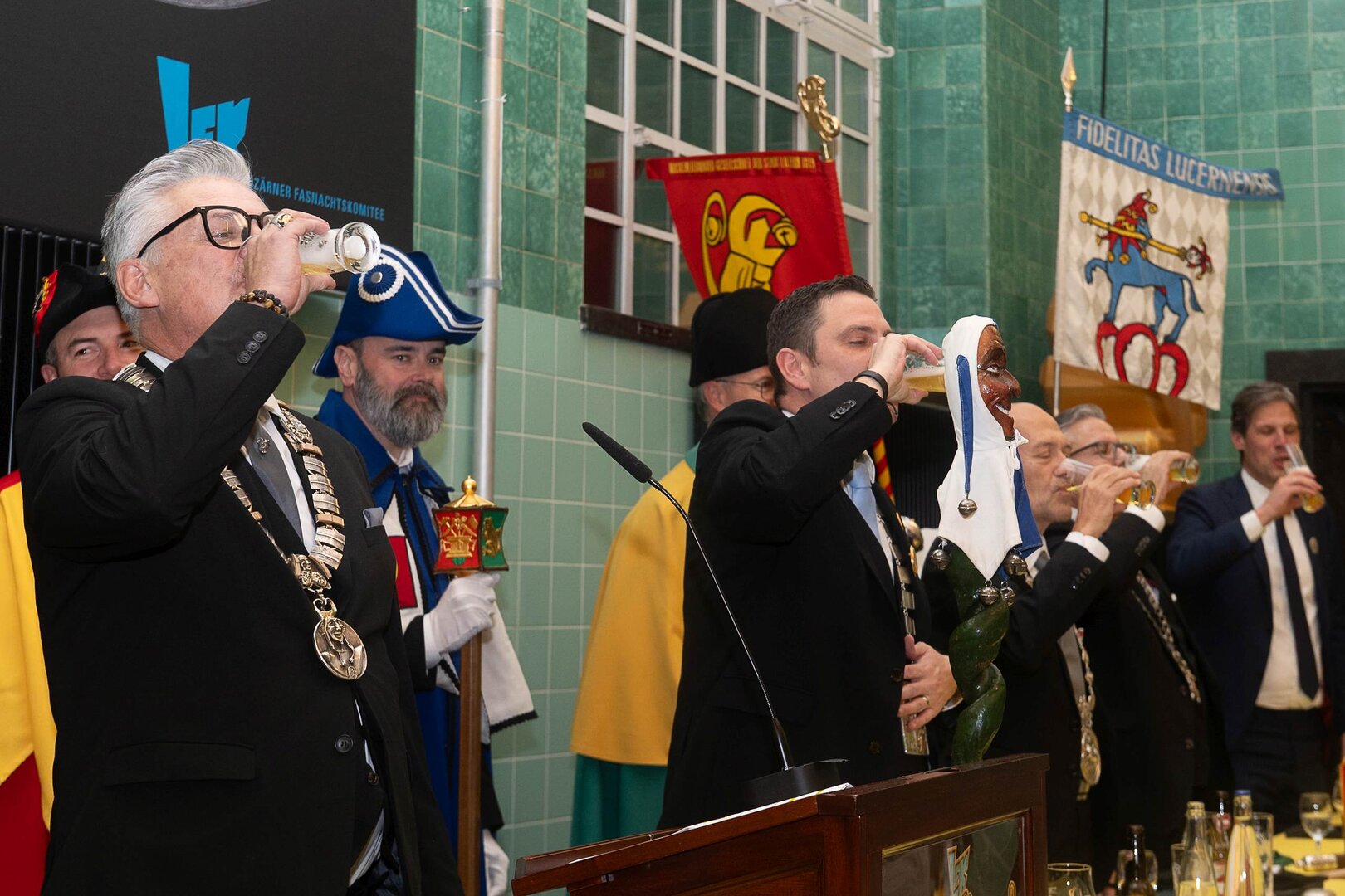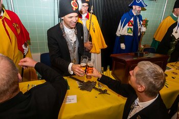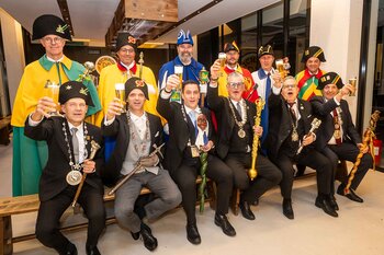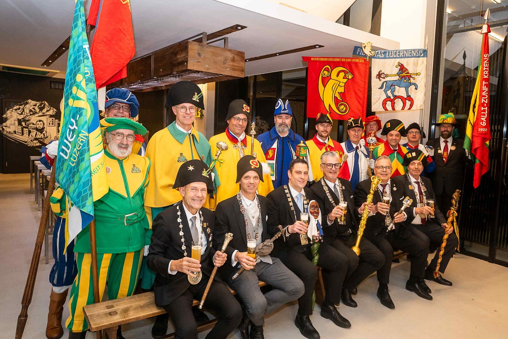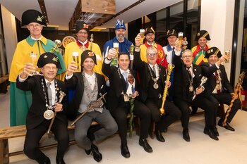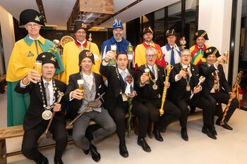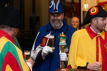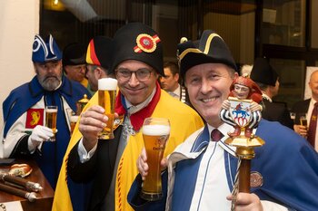 ph. Der Schalander-Empfang in der Brauerei Eichhof ist geprägt von Traditionen, die seit Jahrzehnten gepflegt werden. So das erste "Föteli" der Meister und Präsidenten. Und weil der Schalander - angeblich - auf Krienser Boden steht, ist an diesem Anlass auch der Krienser Gallivater mit dabei. Hoch den Bierhumpen, ein erstes gemeinsames Bild für die Medien und schon werden die Meister und Präsidenten von den LFK-Delegierten und Gästen mit stehenden Ovationen empfangen.