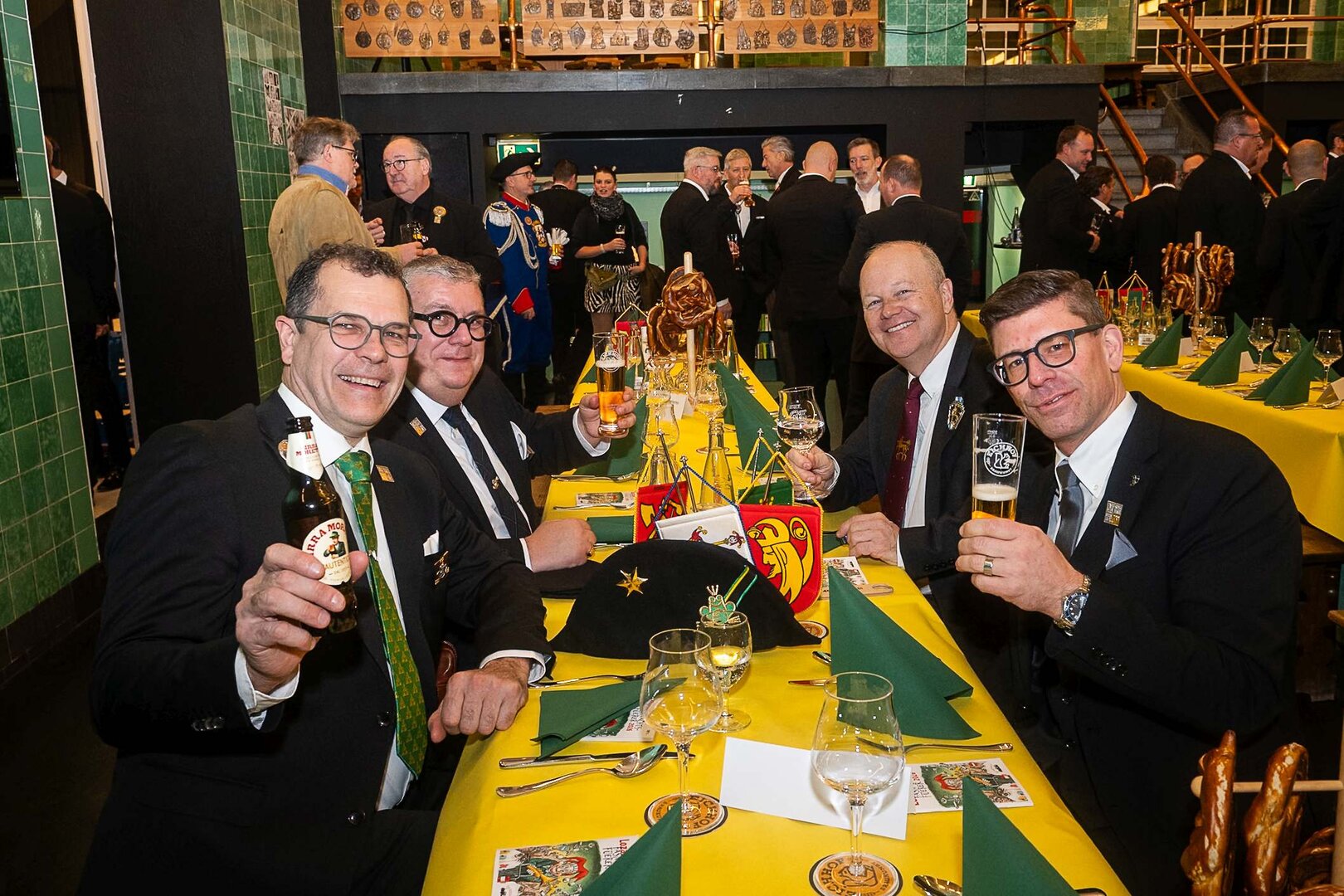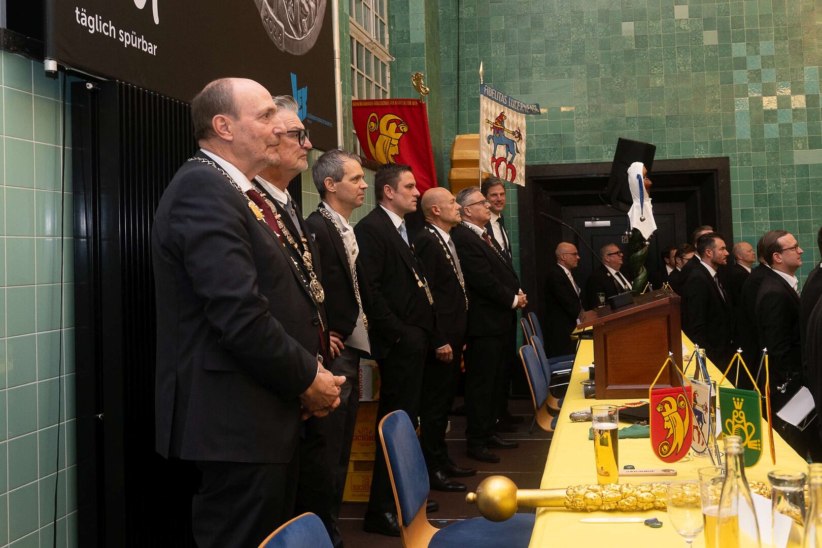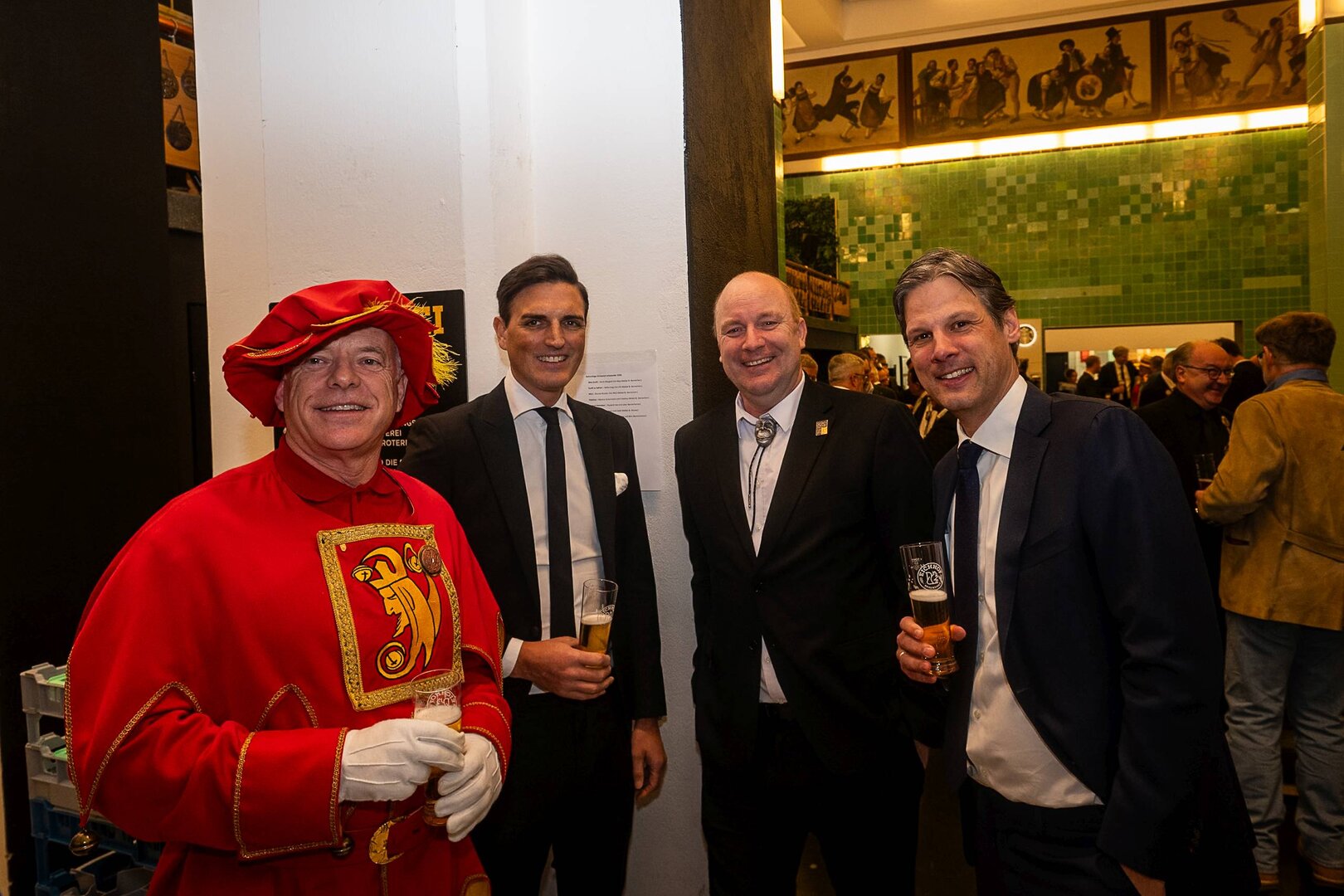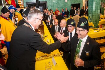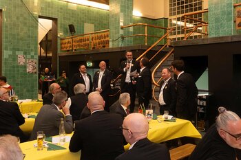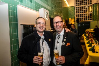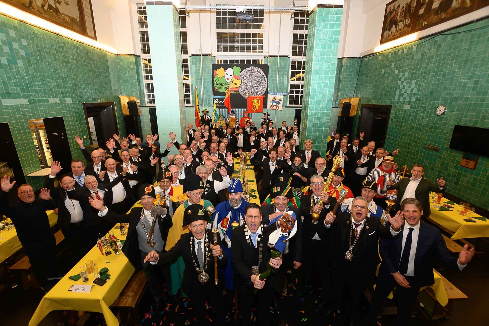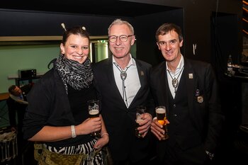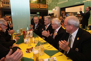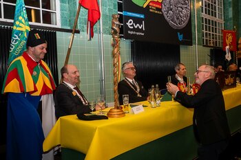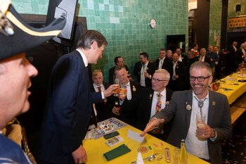 ph. Der Schalander-Empfang in der Brauerei Eichhof ist geprägt von Traditionen, die seit Jahrzehnten gepflegt werden. So das erste "Föteli" der Meister und Präsidenten. Und weil der Schalander - angeblich - auf Krienser Boden steht, ist an diesem Anlass auch der Krienser Gallivater mit dabei. Hoch den Bierhumpen, ein erstes gemeinsames Bild für die Medien und schon werden die Meister und Präsidenten von den LFK-Delegierten und Gästen mit stehenden Ovationen empfangen.