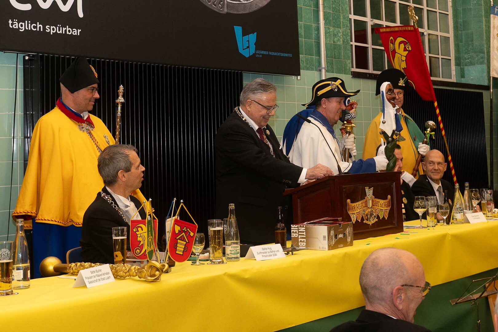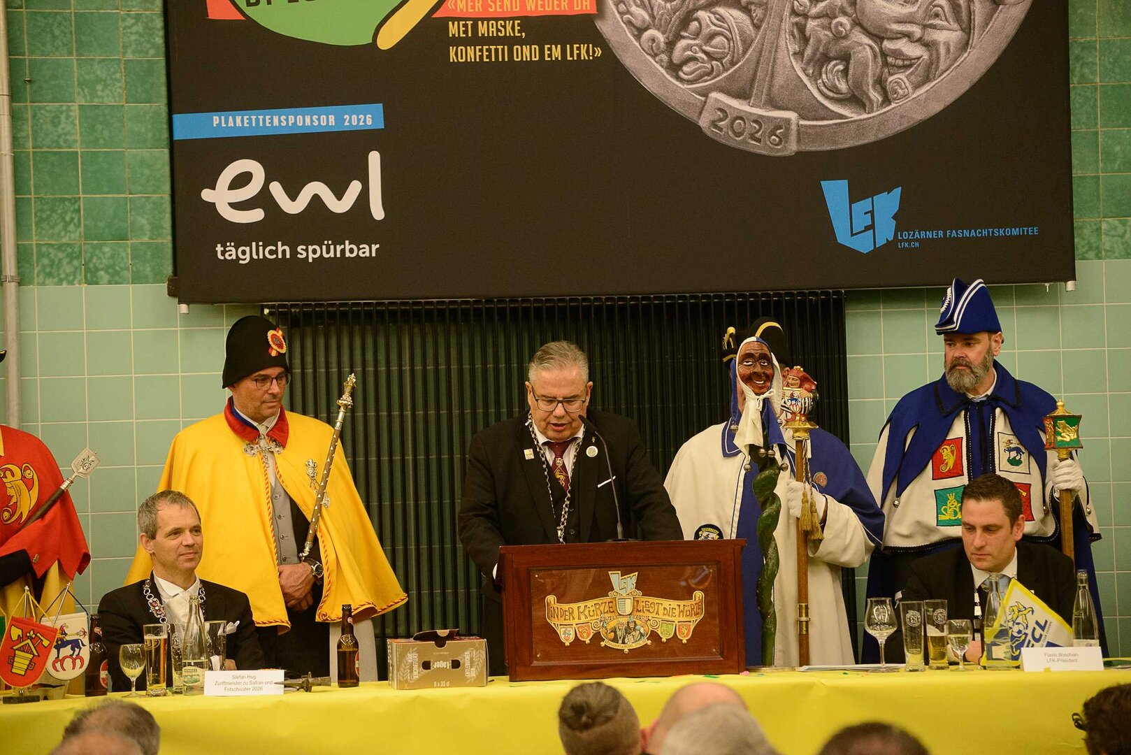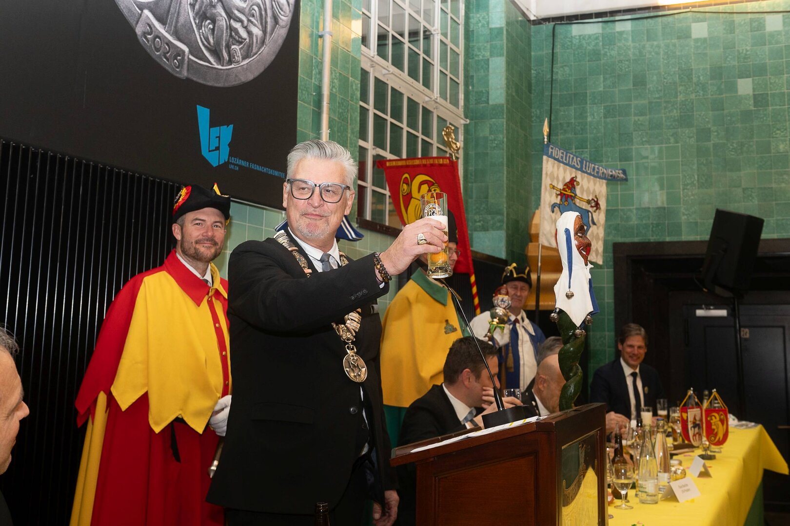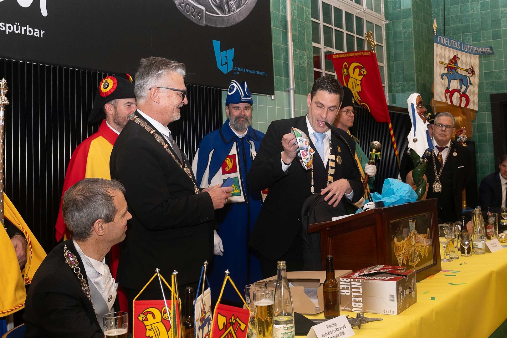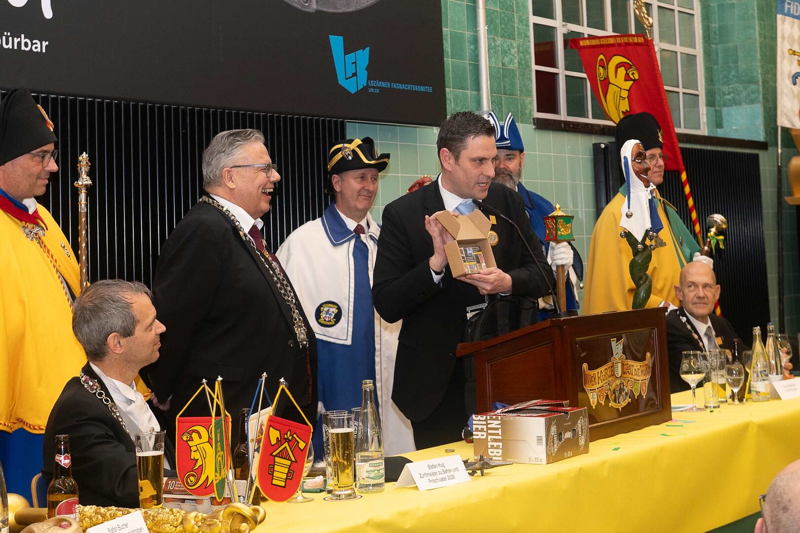 Gespannt ist man natürlich auf die Festansprachen der Fasnachtsgewaltigen. Diesen Reigen eröffnet jeweils der Chef der gastgebenden Brauerei Eichhof - bereits zum dritten Mal vom Managing Director Diederik Vos. Der gebürtige Niederländer sagte selber, dass er offenbar an Rudi Karell erinnert. Der einzigartige LFK-Präsident Flavio Boschian begrüsste denn auch die übrigen Festredner. Der Zunftmeister der Wey-Zunft Berto Margraf zeigte sich mit seinem Motto "gnüss s'Läbe" voller Tatendrang. Der neue Zunftmeister zu Safran und Fritschivater 2026 Stefan Hug war überrascht, dass der "Ultra" Büsche im Schalander anzutreffen ist und der MLG-Präsident überzeugte wieder mit einer überlangen Rede von Bier-Ei Marathon und seinem Köbeli usem Entlebuch. So hingegen schwärmte hochwohllöblichen Dominus Markus Achermann von seinen Vorrednern, welcher sich wohl fühlt im Ü60-Club.