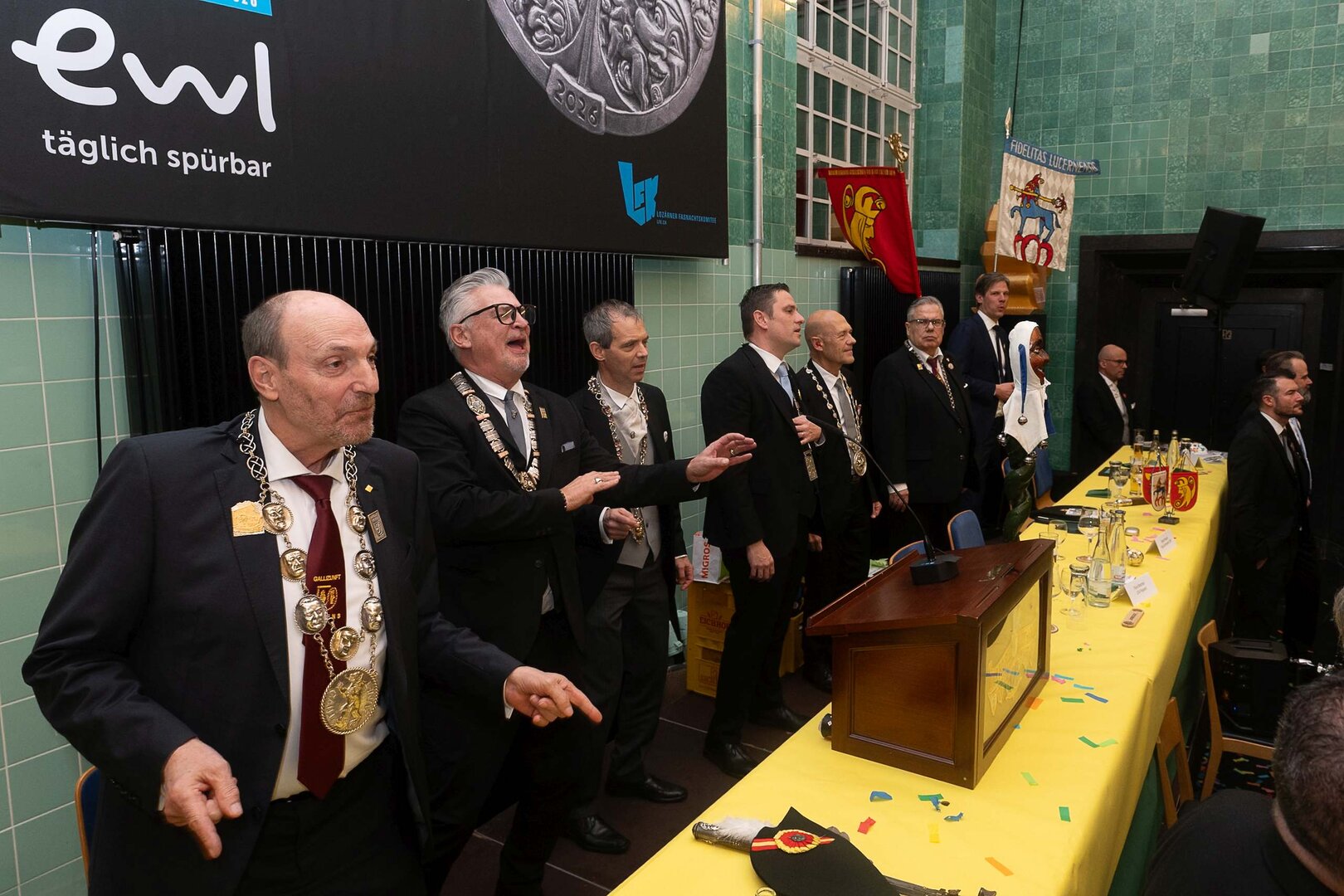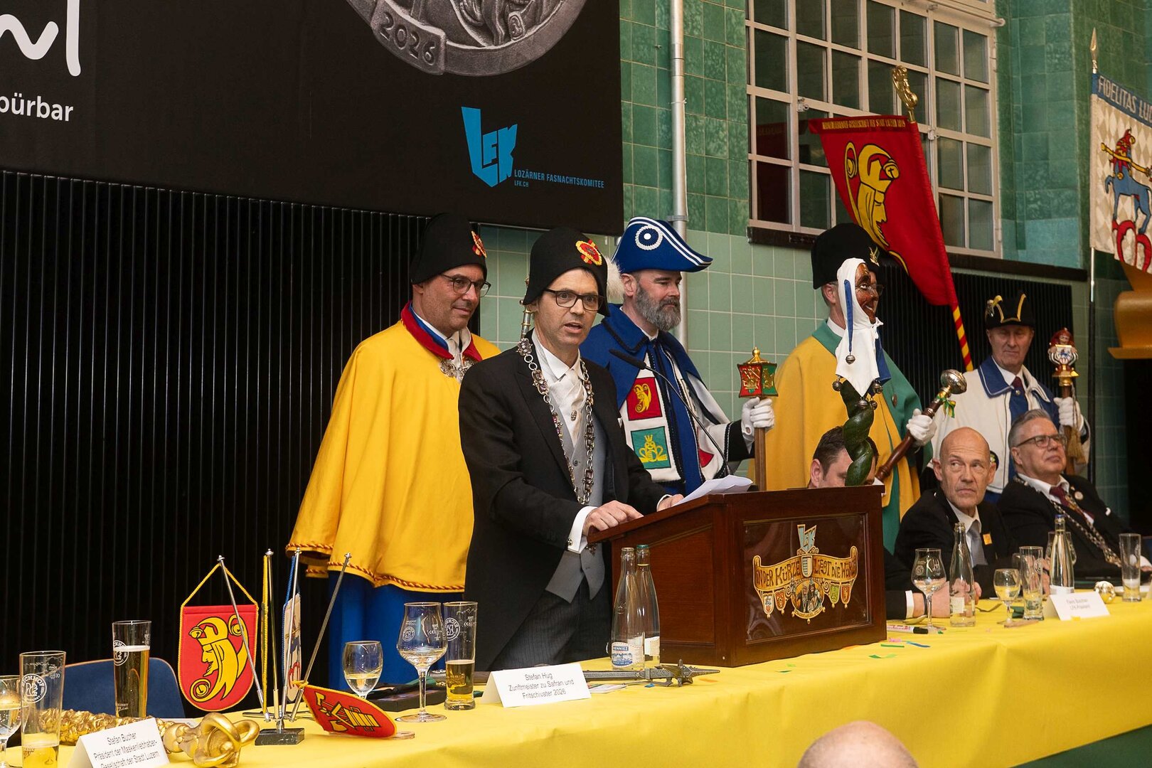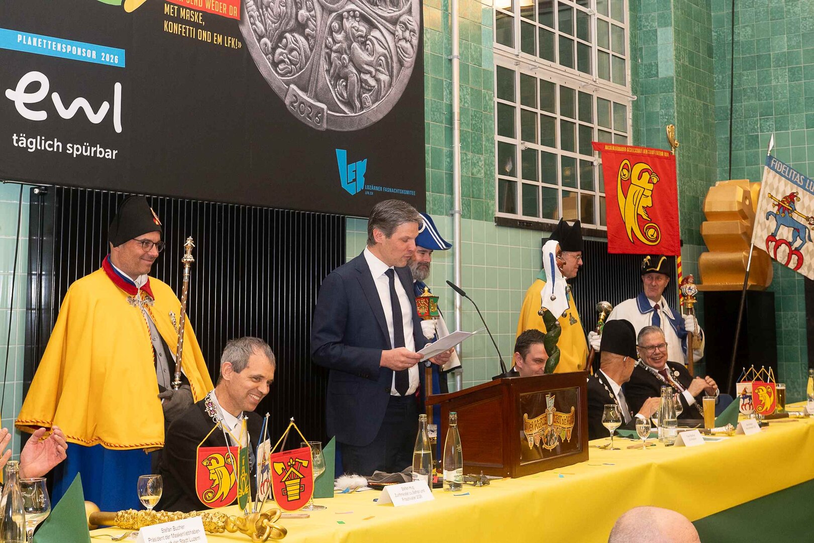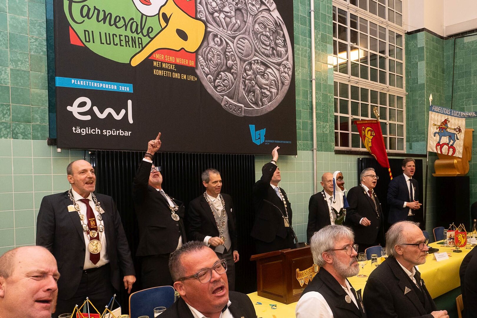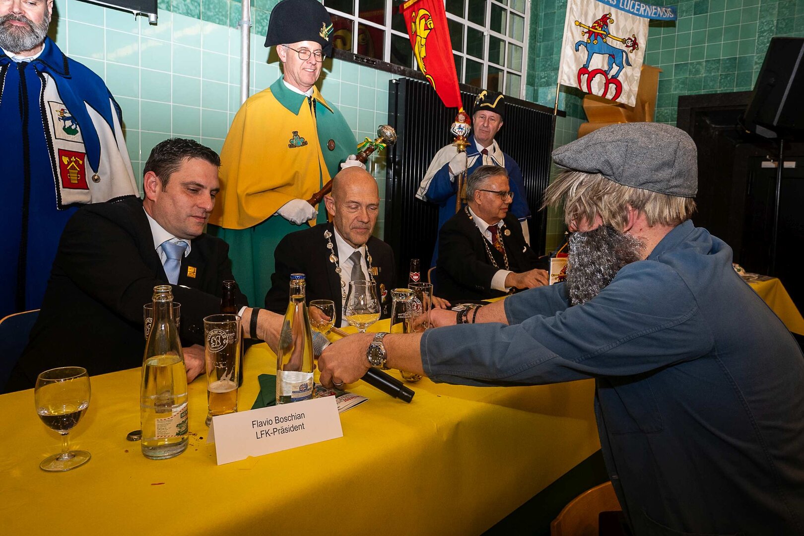 Gespannt ist man natürlich auf die Festansprachen der Fasnachtsgewaltigen. Diesen Reigen eröffnet jeweils der Chef der gastgebenden Brauerei Eichhof - bereits zum dritten Mal vom Managing Director Diederik Vos. Der gebürtige Niederländer sagte selber, dass er offenbar an Rudi Karell erinnert. Der einzigartige LFK-Präsident Flavio Boschian begrüsste denn auch die übrigen Festredner. Der Zunftmeister der Wey-Zunft Berto Margraf zeigte sich mit seinem Motto "gnüss s'Läbe" voller Tatendrang. Der neue Zunftmeister zu Safran und Fritschivater 2026 Stefan Hug war überrascht, dass der "Ultra" Büsche im Schalander anzutreffen ist und der MLG-Präsident überzeugte wieder mit einer überlangen Rede von Bier-Ei Marathon und seinem Köbeli usem Entlebuch. So hingegen schwärmte hochwohllöblichen Dominus Markus Achermann von seinen Vorrednern, welcher sich wohl fühlt im Ü60-Club.