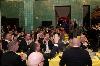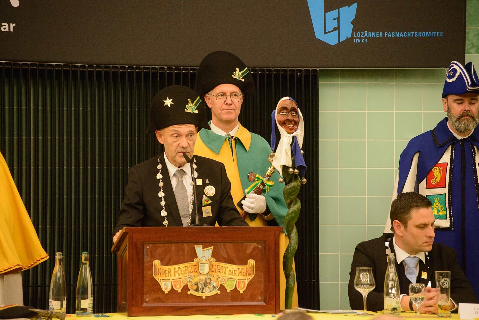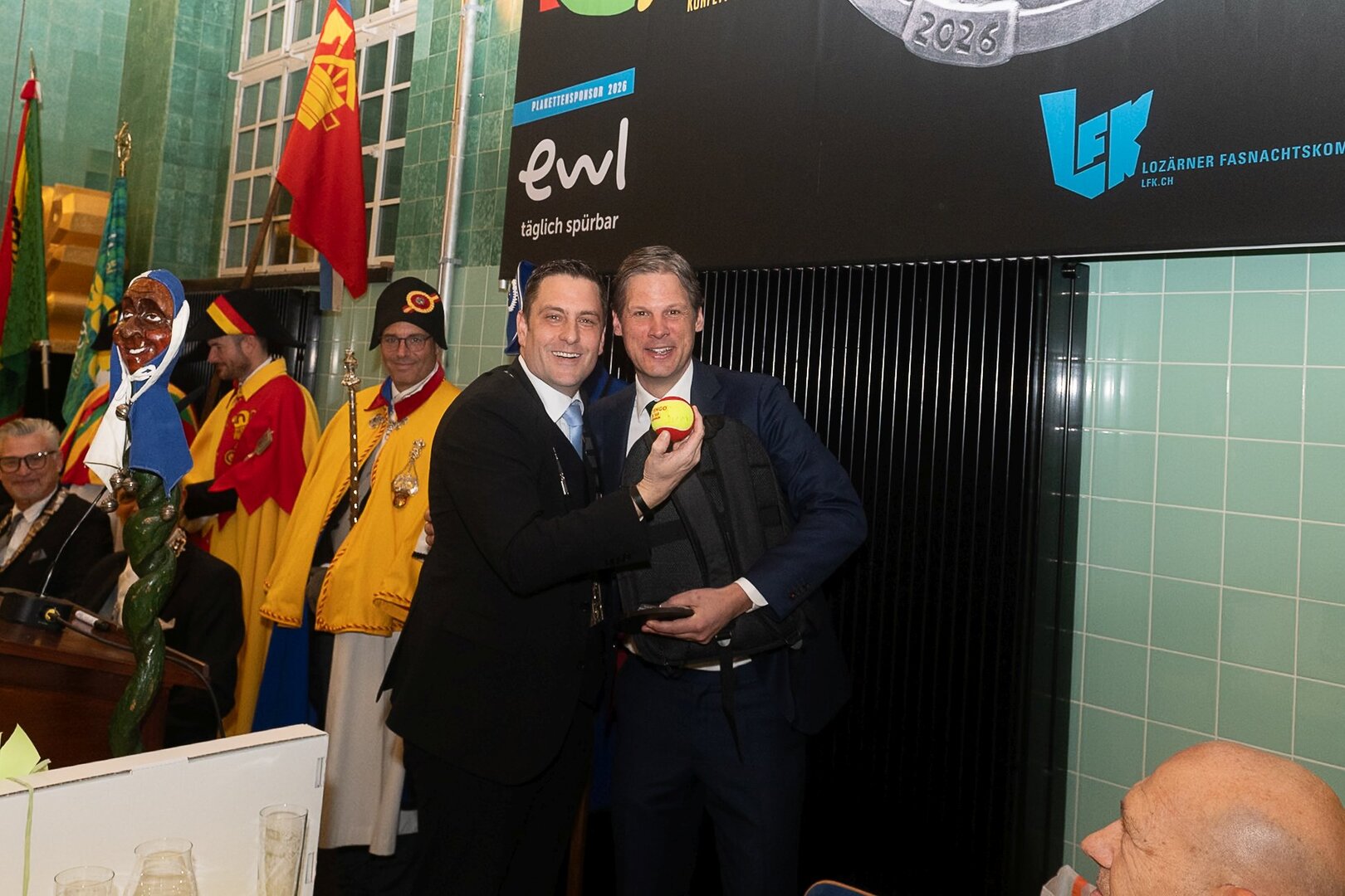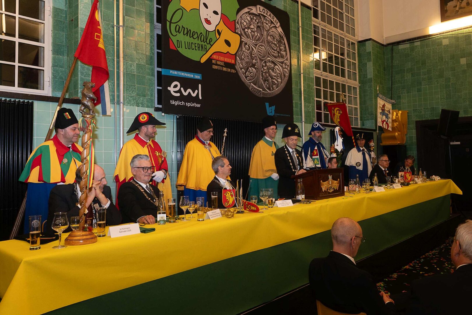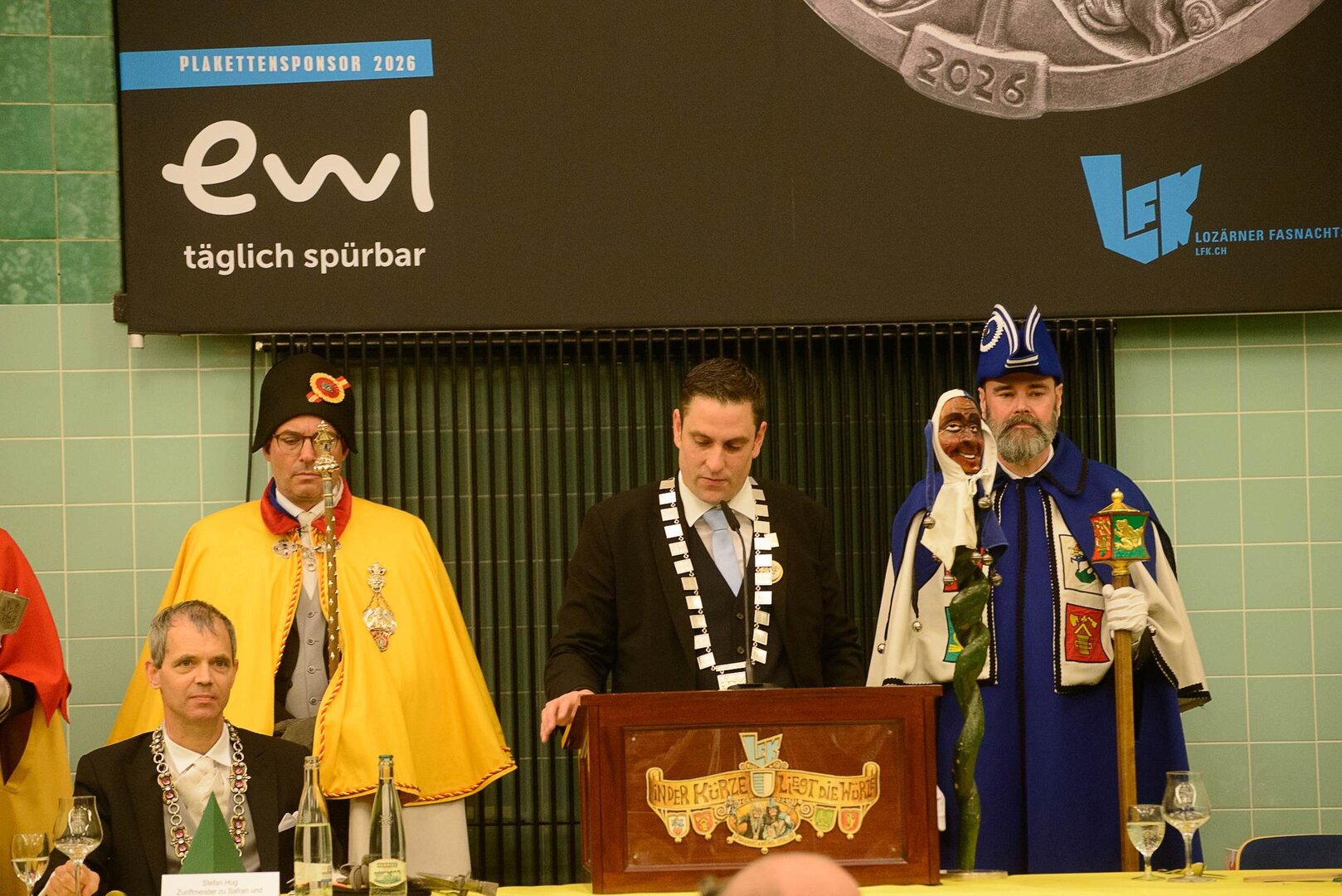 Gespannt ist man natürlich auf die Festansprachen der Fasnachtsgewaltigen. Diesen Reigen eröffnet jeweils der Chef der gastgebenden Brauerei Eichhof - bereits zum dritten Mal vom Managing Director Diederik Vos. Der gebürtige Niederländer sagte selber, dass er offenbar an Rudi Karell erinnert. Der einzigartige LFK-Präsident Flavio Boschian begrüsste denn auch die übrigen Festredner. Der Zunftmeister der Wey-Zunft Berto Margraf zeigte sich mit seinem Motto "gnüss s'Läbe" voller Tatendrang. Der neue Zunftmeister zu Safran und Fritschivater 2026 Stefan Hug war überrascht, dass der "Ultra" Büsche im Schalander anzutreffen ist und der MLG-Präsident überzeugte wieder mit einer überlangen Rede von Bier-Ei Marathon und seinem Köbeli usem Entlebuch. So hingegen schwärmte hochwohllöblichen Dominus Markus Achermann von seinen Vorrednern, welcher sich wohl fühlt im Ü60-Club.