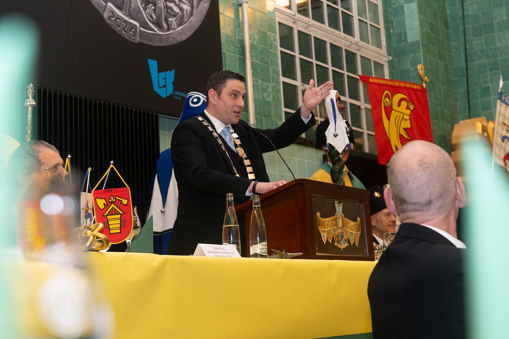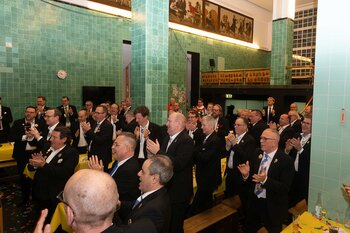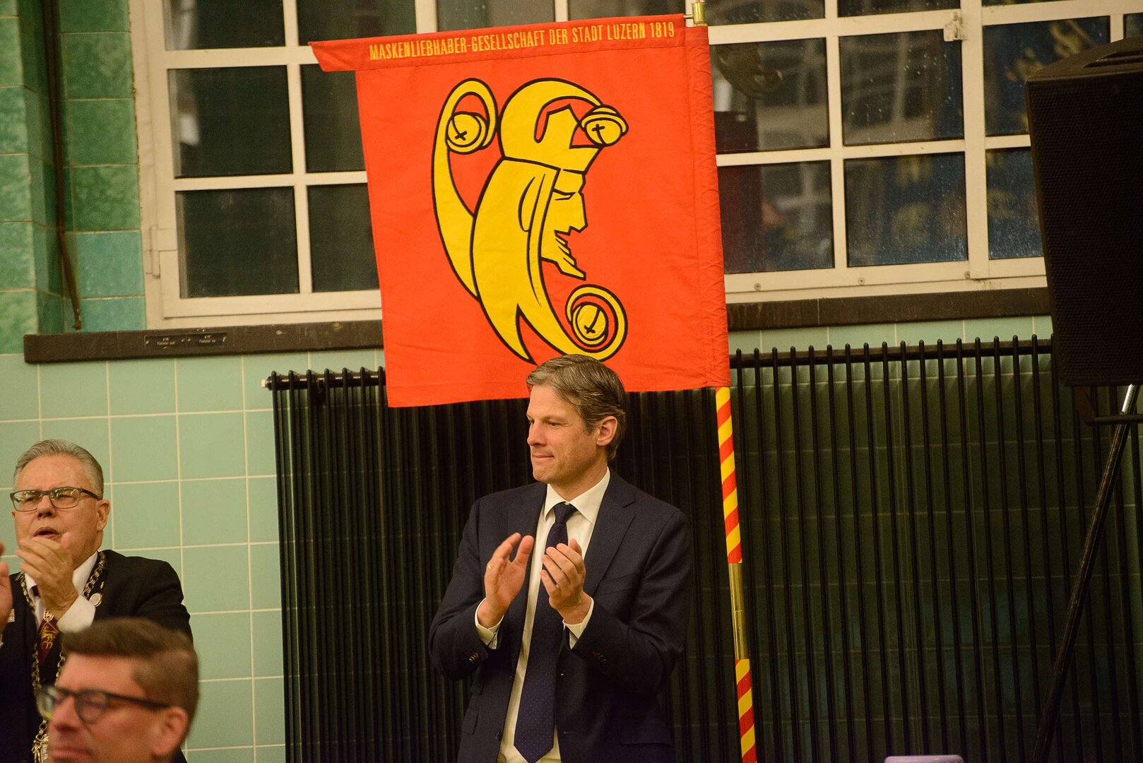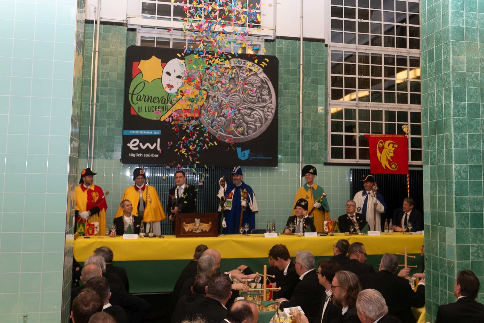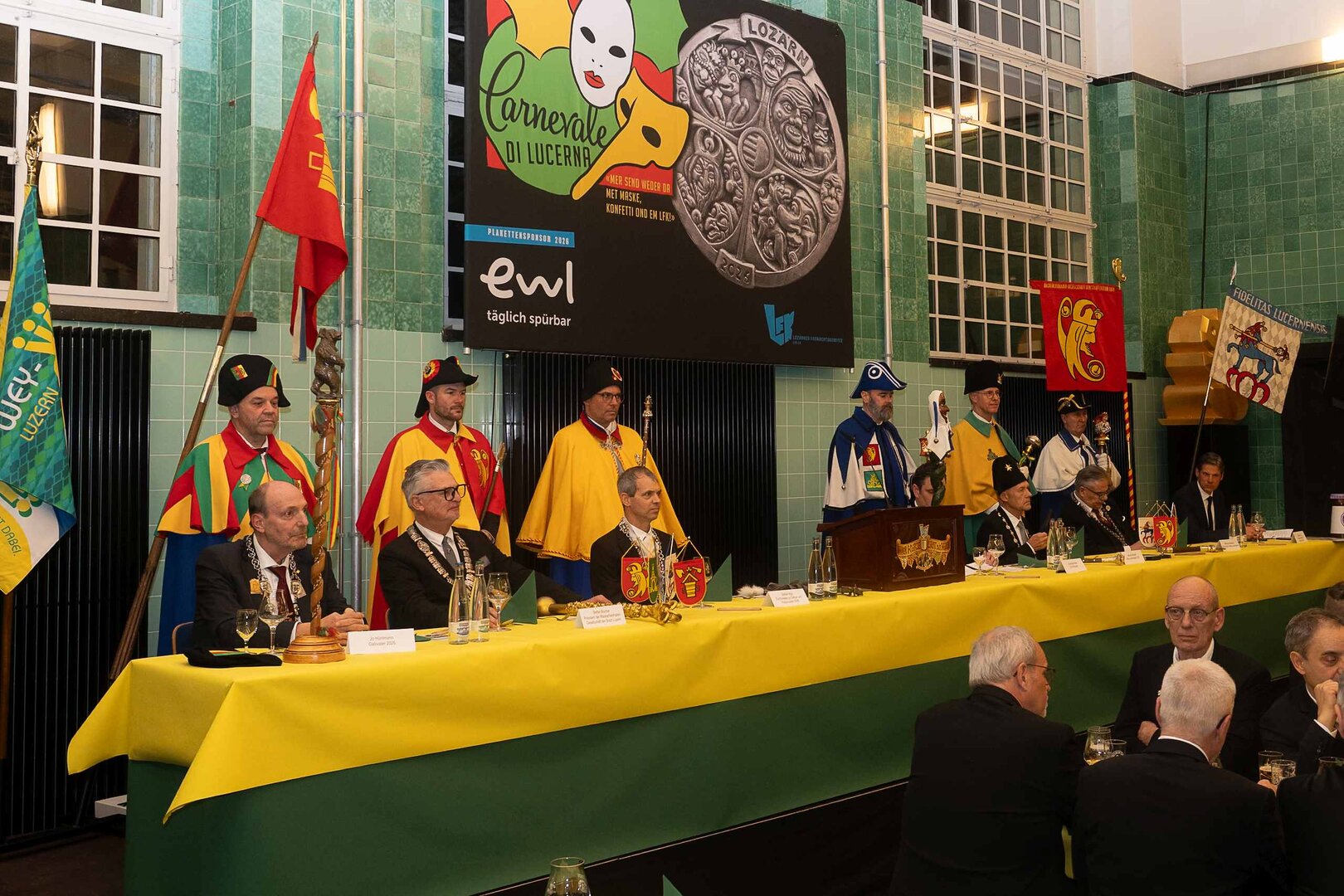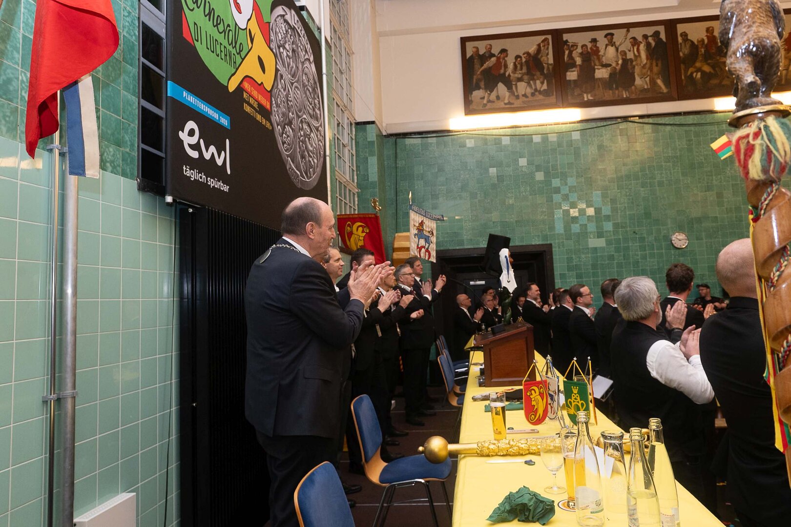 Gespannt ist man natürlich auf die Festansprachen der Fasnachtsgewaltigen. Diesen Reigen eröffnet jeweils der Chef der gastgebenden Brauerei Eichhof - bereits zum dritten Mal vom Managing Director Diederik Vos. Der gebürtige Niederländer sagte selber, dass er offenbar an Rudi Karell erinnert. Der einzigartige LFK-Präsident Flavio Boschian begrüsste denn auch die übrigen Festredner. Der Zunftmeister der Wey-Zunft Berto Margraf zeigte sich mit seinem Motto "gnüss s'Läbe" voller Tatendrang. Der neue Zunftmeister zu Safran und Fritschivater 2026 Stefan Hug war überrascht, dass der "Ultra" Büsche im Schalander anzutreffen ist und der MLG-Präsident überzeugte wieder mit einer überlangen Rede von Bier-Ei Marathon und seinem Köbeli usem Entlebuch. So hingegen schwärmte hochwohllöblichen Dominus Markus Achermann von seinen Vorrednern, welcher sich wohl fühlt im Ü60-Club.