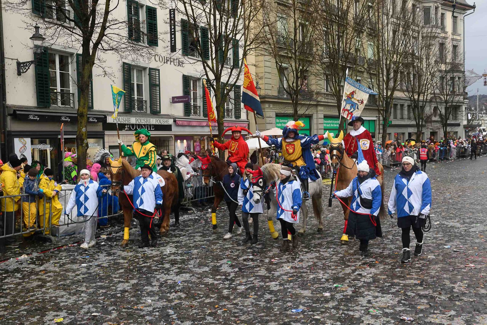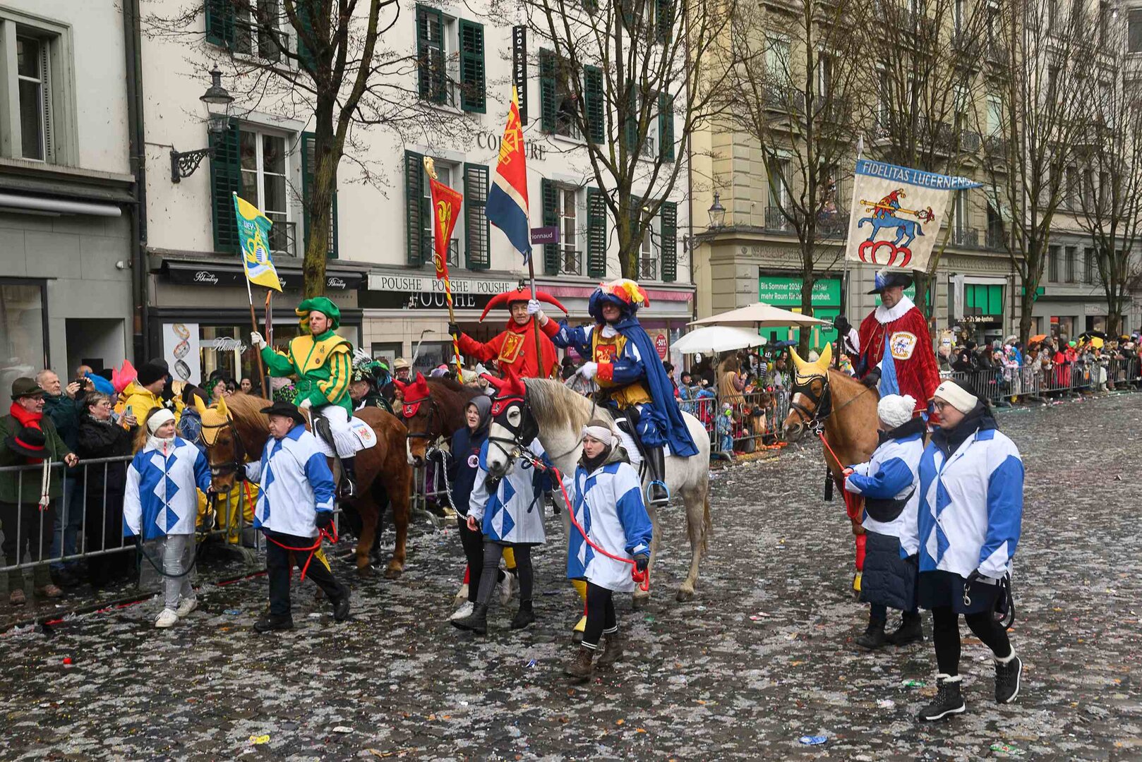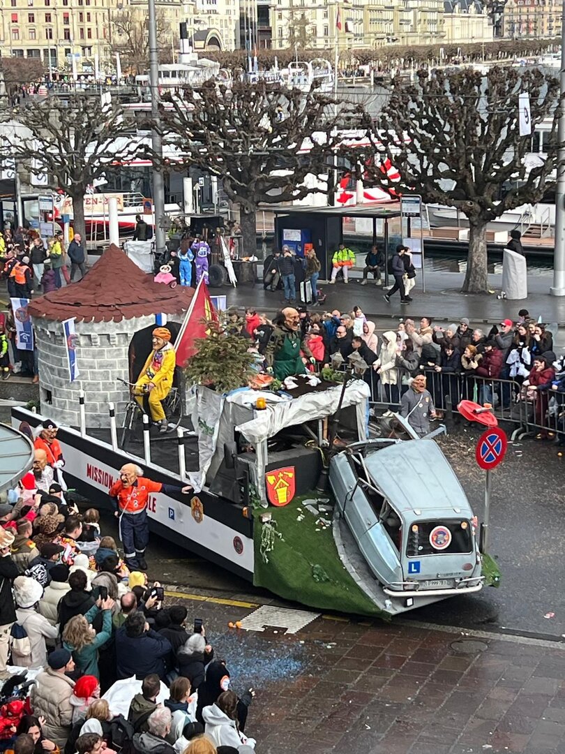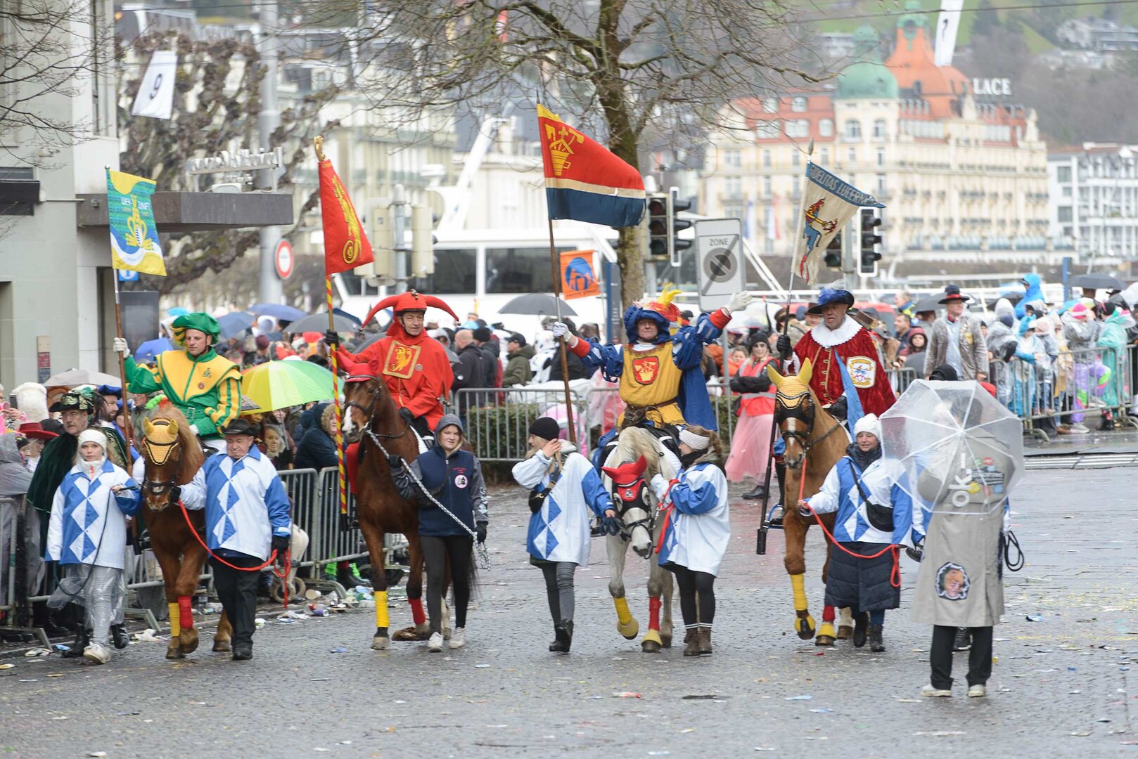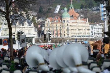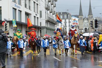 ph. 47 Umzugsnummern konnte das LFK in diesem Jahr einladen, mehrere Teilnehmenden mussten vertröstet werden. Punkt 14 Uhr starteten die Bannerherren zu Pferd der vier LFK-Zünfte und -Gesellschaften, vom Luzernerhof via Schweizerhofquai, Kapellplatz mit Fritschibrunnen, Seebrücke, Bahnhofplatz, Pilatusstrasse bis hin zur Winkelriedstrasse, mit Auflösung beim Helvetiaplatz. Das Wetter war trotz regnerischen Vorhersagen äusserst Milde und sogar die Sonne zeigte sich einige Male. Petrus muss ein Fasnächtler sein!