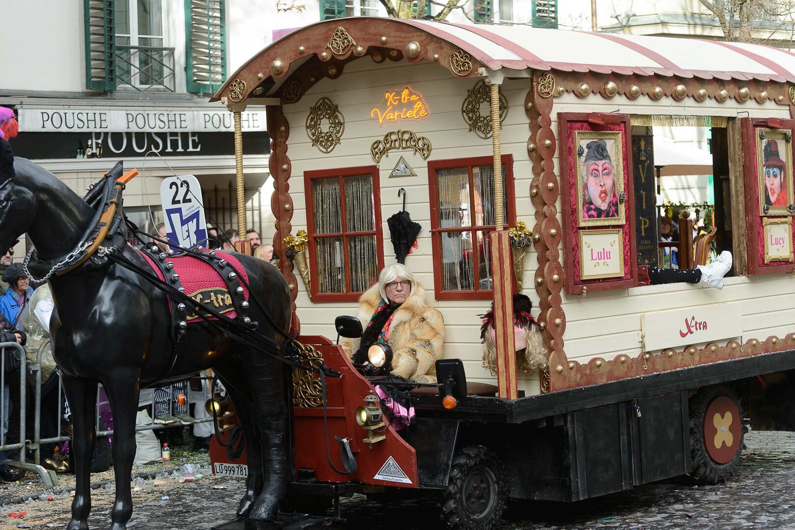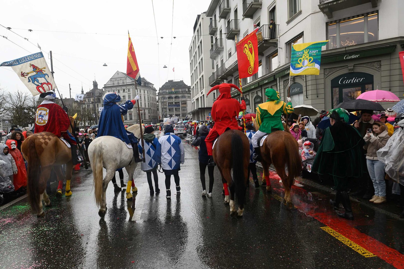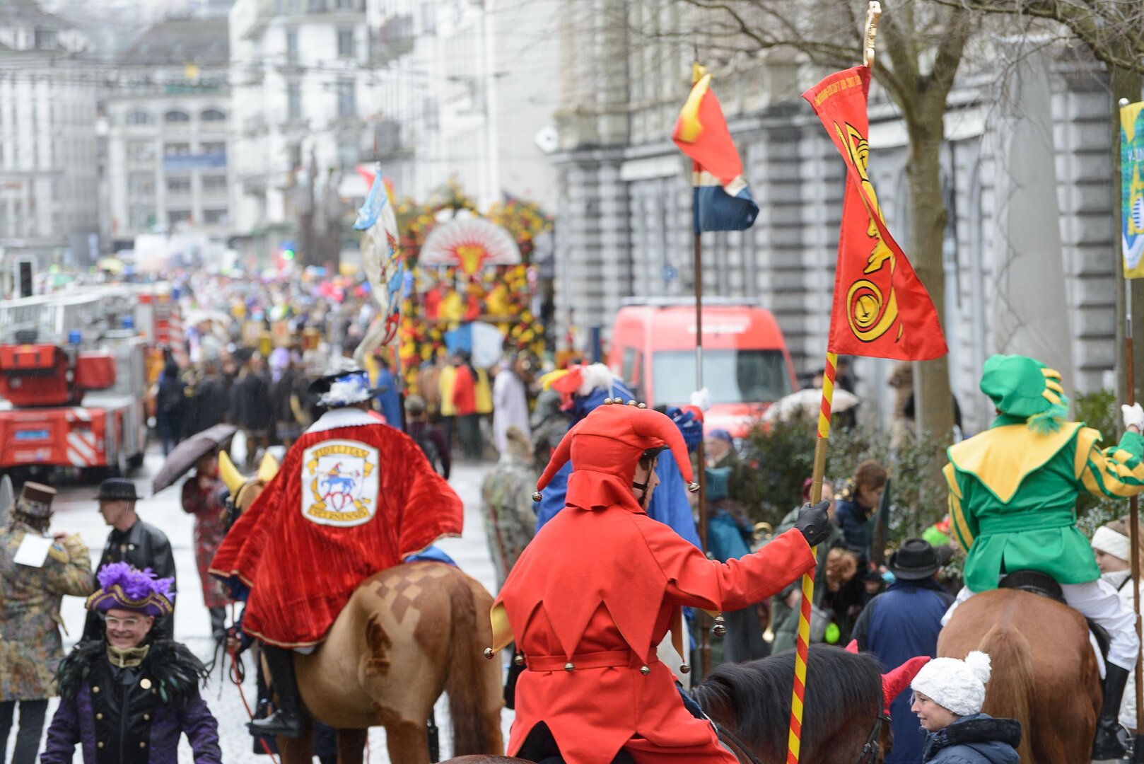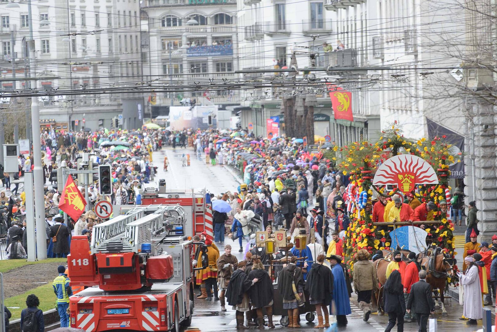 ph. 47 Umzugsnummern konnte das LFK in diesem Jahr einladen, mehrere Teilnehmenden mussten vertröstet werden. Punkt 14 Uhr starteten die Bannerherren zu Pferd der vier LFK-Zünfte und -Gesellschaften, vom Luzernerhof via Schweizerhofquai, Kapellplatz mit Fritschibrunnen, Seebrücke, Bahnhofplatz, Pilatusstrasse bis hin zur Winkelriedstrasse, mit Auflösung beim Helvetiaplatz. Das Wetter war trotz regnerischen Vorhersagen äusserst Milde und sogar die Sonne zeigte sich einige Male. Petrus muss ein Fasnächtler sein!